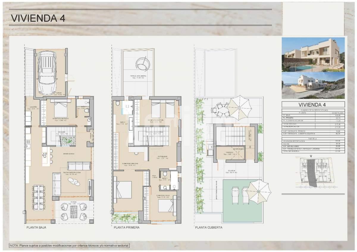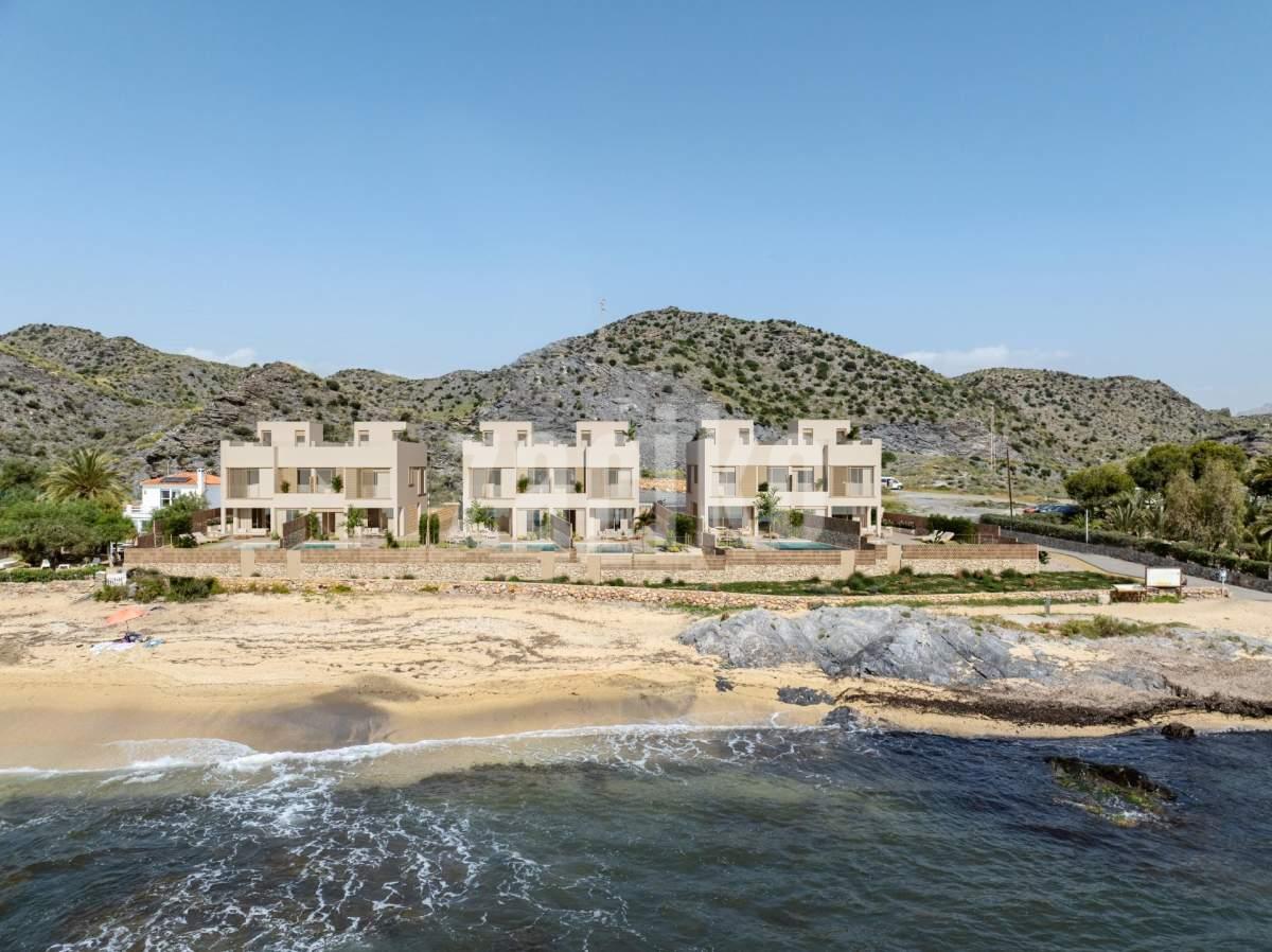 Villas adosadas de lujo frente al mar en Cala Panizo, Cuevas de Almanzora, Almería Vida exclusiva en primera línea de playa Experimente el auténtico lujo mediterráneo con esta exclusiva colección de 6 villas adosadas de primera calidad situadas en primera línea de playa en Cala Panizo, en Cuevas de Almanzora, Almería. Diseñadas para aquellos que valoran el estilo de vida, la serenidad y la conexión directa con el mar, estas viviendas ofrecen un entorno incomparable donde el sonido de las olas y las vistas panorámicas al mar se convierten en parte de la vida cotidiana. Arquitectura moderna y características premium Cada villa cuenta con 4 dormitorios y 3 baños en amplias parcelas de más de 300 m². La arquitectura combina el diseño mediterráneo moderno con la funcionalidad, ofreciendo interiores elegantes, espacios abiertos y luminosos y acabados de alta calidad en todas las estancias. La planta baja incluye un garaje privado cerrado, zona de lavandería, un amplio salón con cocina abierta, acceso directo a un porche cubierto y un bonito jardín delantero con una piscina infinita con vistas al mar. También hay un dormitorio y un cuarto de baño en esta planta, ideal para invitados o para una vida flexible. La primera planta ofrece tres dormitorios adicionales y dos baños, uno de ellos en suite. El solárium de la azotea, de 69 m², ofrece espacio para una cocina de verano y la preinstalación de un jacuzzi, creando un entorno perfecto para disfrutar de las puestas de sol y relajarse en privado. Las viviendas están preparadas para la instalación de un ascensor bajo petición. Las cocinas totalmente equipadas con electrodomésticos, los baños completos, el aire acondicionado por conductos con sistema de alta eficiencia y los refinados materiales interiores garantizan el confort y la comodidad durante todo el año. Prestigiosa ubicación costera Cala Panizo es una tranquila zona residencial costera conocida por sus aguas cristalinas, sus pequeñas calas y su belleza natural. La urbanización se encuentra justo al sur de Pozo del Esparto y muy cerca de Mar de Pulpi, San Juan de los Terreros y Aguilon Golf. La encantadora ciudad de Águilas, con su puerto deportivo, servicios y restaurantes, también se encuentra cerca. Distancias clave Mar de Pulpi: 6 km San Juan de los Terreros: 8 km Puerto deportivo de Águilas: 25 km Aguilon Golf: 10 km Aeropuerto de Almería: aprox. 100 km Aeropuerto de Murcia: aprox. 120 km Aeropuerto de Alicante: aprox. 180 km Descubra su estilo de vida frente al mar Disfrute de privacidad, lujo y acceso directo al Mediterráneo en un entorno diseñado para la comodidad y la relajación. Póngase en contacto con nosotros hoy mismo para conocer la disponibilidad, los precios y concertar una visita a estas exclusivas villas frente al mar en Cala Panizo.