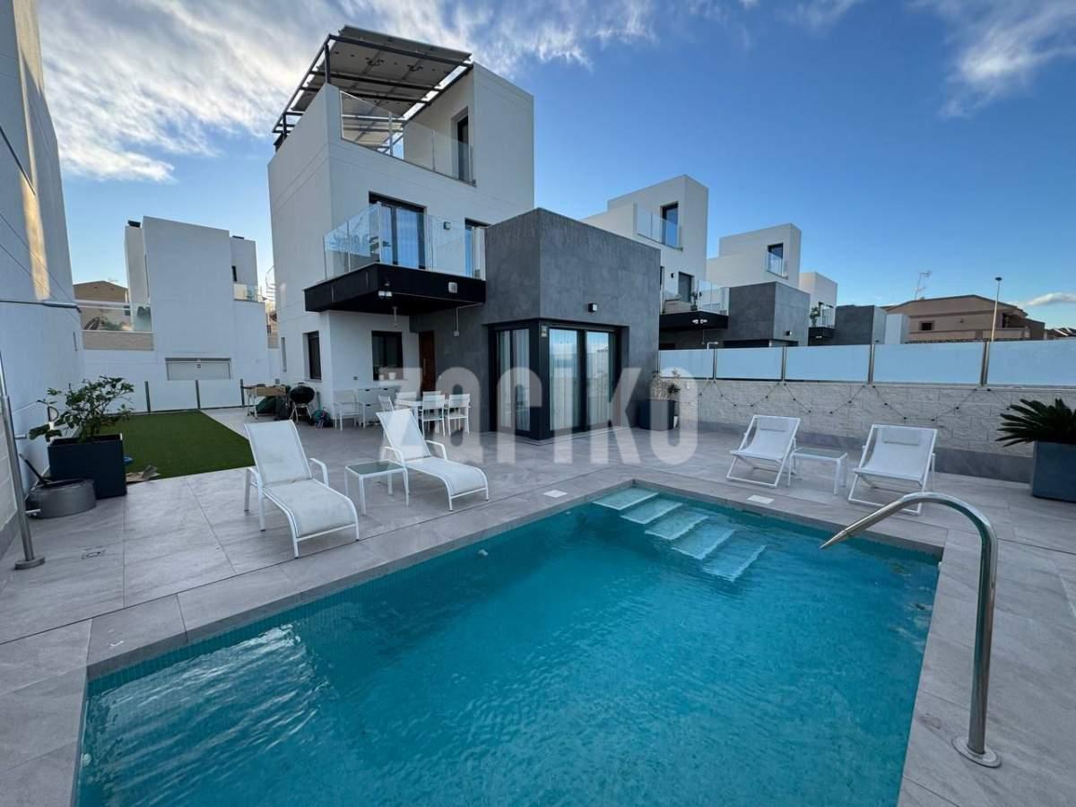 Te ofrecemos una villa de tres pisos en Los Altos. La casa tiene tres dormitorios y tres baños. En el primer piso hay una cocina abierta al comedor y a la sala de estar. En el tercer piso hay una zona de terraza en la azotea que se puede habilitar como área de descanso.En el sótano hay una habitación que también se puede habilitar como sala de juegos, un gimnasio o un cine en casa.En la zona exterior junto a la casa hay una piscina privada.Desde la azotea se puede disfrutar de una vista maravillosa de los lagos salados.Esta propiedad es una excelente inversión, ya que se puede alquilar, siendo especialmente popular en verano y generando ingresos.Al comprar una propiedad en España, es posible solicitar la residencia en España. Nuestra empresa ayuda a tramitar cualquier tipo de residencia.