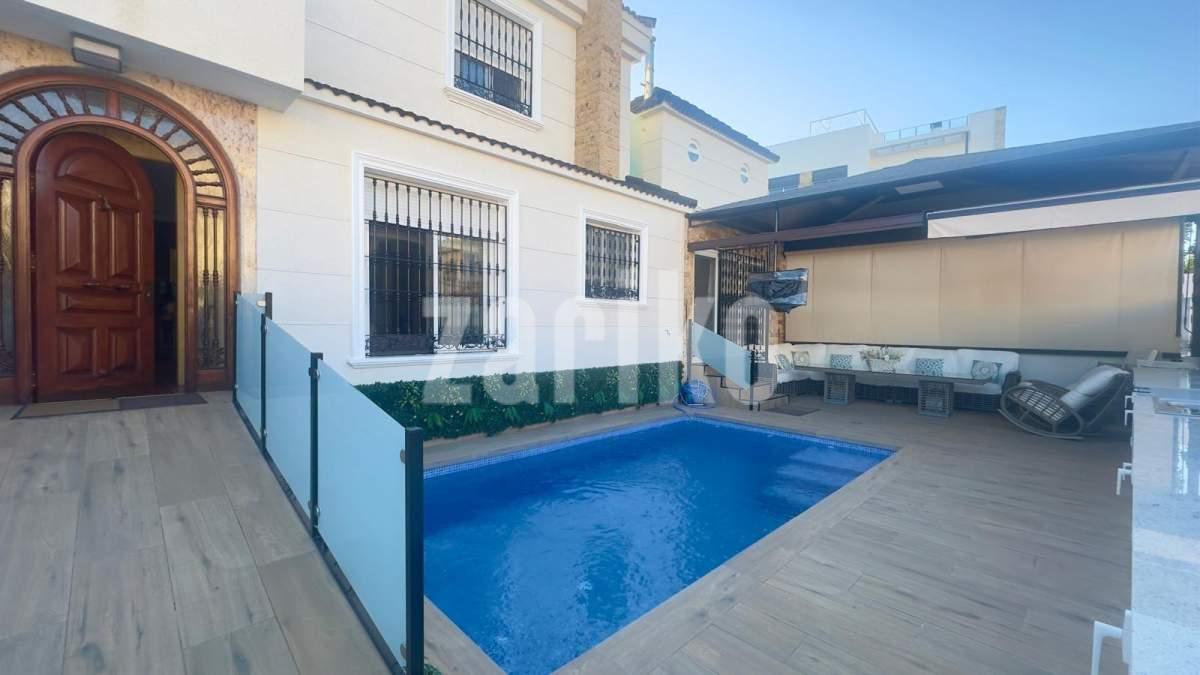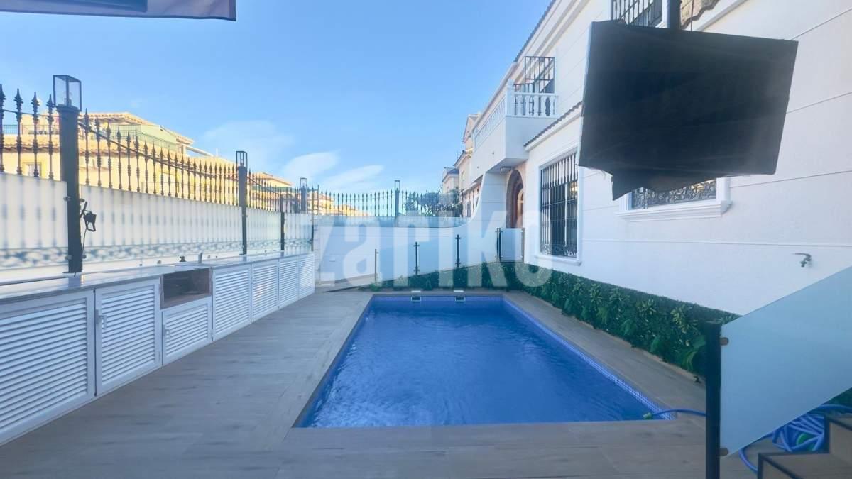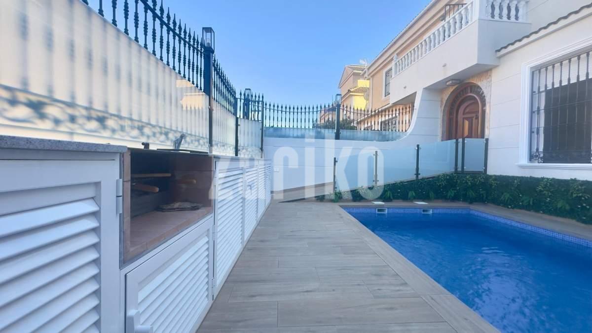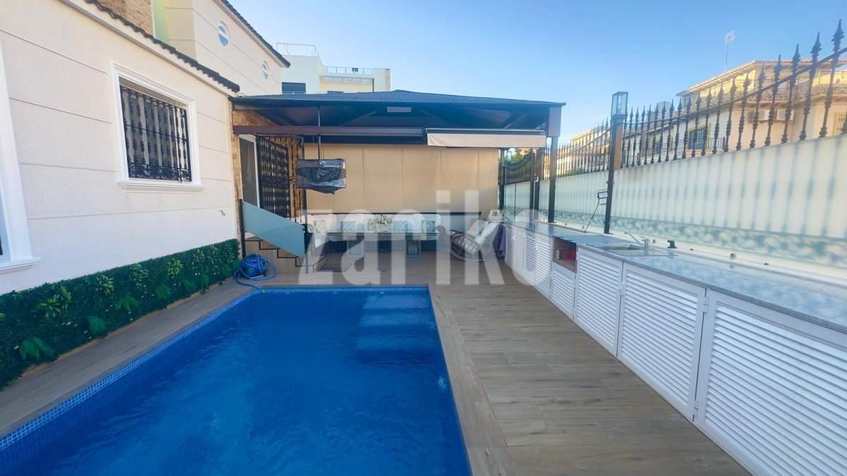 Casa Adosada en Esquina en Orihuela Costa – Urbanización Marco Polo A tan solo 1.500 metros del mar, en la codiciada Urbanización Marco Polo, se encuentra esta impresionante casa adosada en esquina, una propiedad que combina el encanto mediterráneo con la comodidad moderna. Reformada hace aproximadamente 20 años, se presenta hoy en día con un aspecto actual, funcional y perfectamente cuidado, lista para entrar a vivir sin necesidad de reformas. Exterior Privado y Zona de Ocio Nada más acceder a la parcela, destaca el espacio exterior privado, cuidadosamente diseñado para disfrutar al máximo del clima de la Costa Blanca. A mano derecha se encuentra una piscina privada de excelente tamaño, ideal para relajarse y refrescarse en los meses más cálidos. Junto a ella, una zona de barbacoa completamente equipada invita a compartir momentos con familia y amigos, mientras que un espacio chill-out techado aporta un ambiente relajado y acogedor, perfecto para las tardes de verano o reuniones al aire libre. La vivienda cuenta además con puerta de garaje en la misma parcela, proporcionando comodidad y seguridad al poder estacionar el vehículo dentro de la propiedad. Planta Baja: Amplitud y Confort En el interior, la casa ofrece un salón amplio y luminoso, presidido por una chimenea funcional que aporta calidez en los meses de invierno y realza el carácter acogedor de la vivienda. En esta misma planta encontramos un aseo de cortesía, un dormitorio de invitados ideal para familiares o visitas, y una cocina independiente completamente equipada, que comunica con un comedor adicional y un baño con plato de ducha. Desde esta zona se accede directamente al jardín trasero, donde se ubica nuevamente la zona chill-out, creando una perfecta continuidad entre interior y exterior. Planta Superior: Espacios Privados y Luz Natural Subiendo a la segunda planta se ubica el dormitorio principal, con baño en suite y balcón privado, ofreciendo un ambiente íntimo y confortable. En esta misma planta encontramos un segundo dormitorio doble, otro baño completo con plato de ducha, y un tercer dormitorio amplio que dispone de terraza acristalada con salida a una terraza abierta, ideal para disfrutar del sol durante todo el año. Equipamiento y Detalles Adicionales Todas las estancias de la vivienda cuentan con aire acondicionado, garantizando confort térmico tanto en invierno como en verano. La urbanización Marco Polo dispone además de una piscina comunitaria, aunque esta propiedad destaca precisamente por su piscina y espacios privados, que aportan exclusividad y mayor independencia. Ubicación y Entorno Situada en una zona tranquila y bien comunicada de Orihuela Costa, la casa se encuentra cerca de playas, centros comerciales, restaurantes y servicios, lo que la convierte en una opción ideal tanto como residencia habitual como vivienda vacacional o inversión con alta rentabilidad. En resumen: Esta casa adosada en esquina representa una oportunidad única de disfrutar de una vivienda amplia, moderna, reformada y con espacios exteriores excepcionales, a solo unos minutos del mar. Una propiedad que combina comodidad, privacidad y estilo de vida mediterráneo en una de las zonas más demandadas de la Costa Blanca.