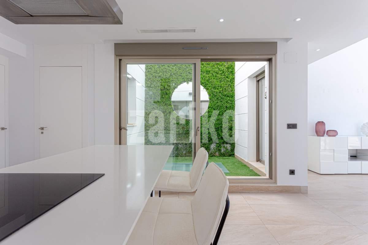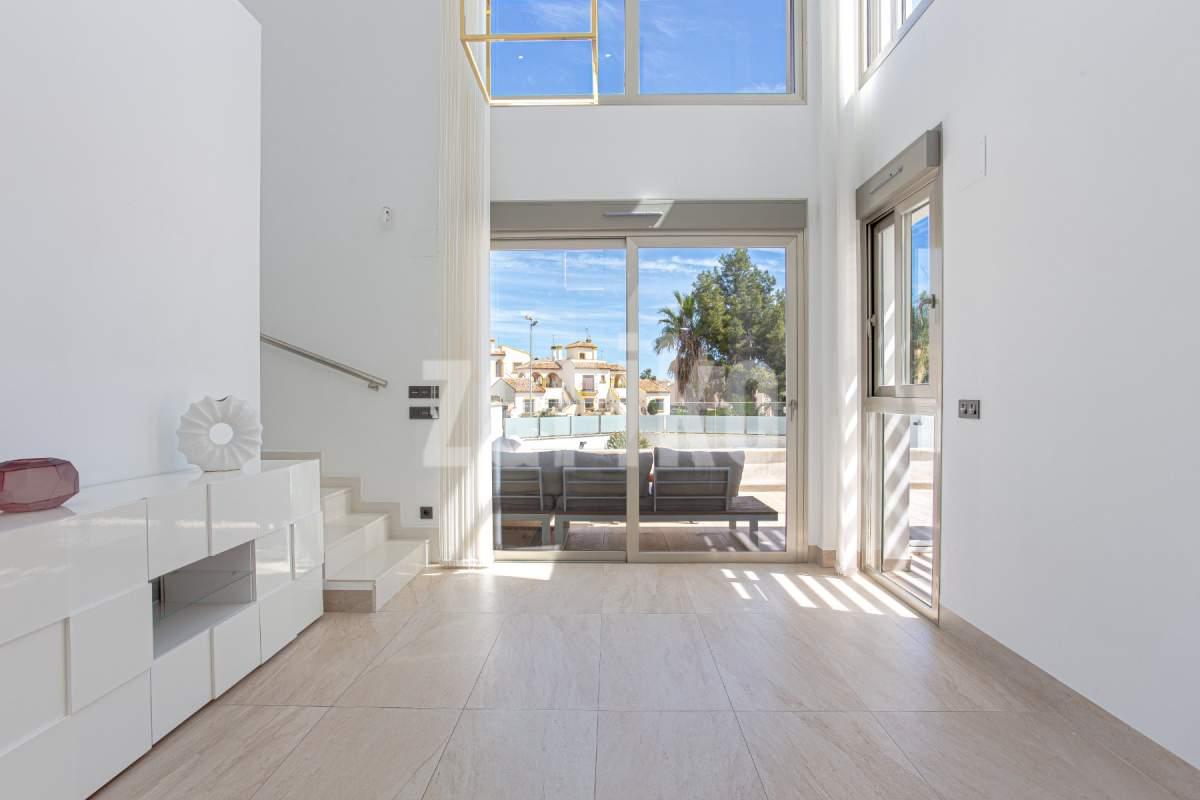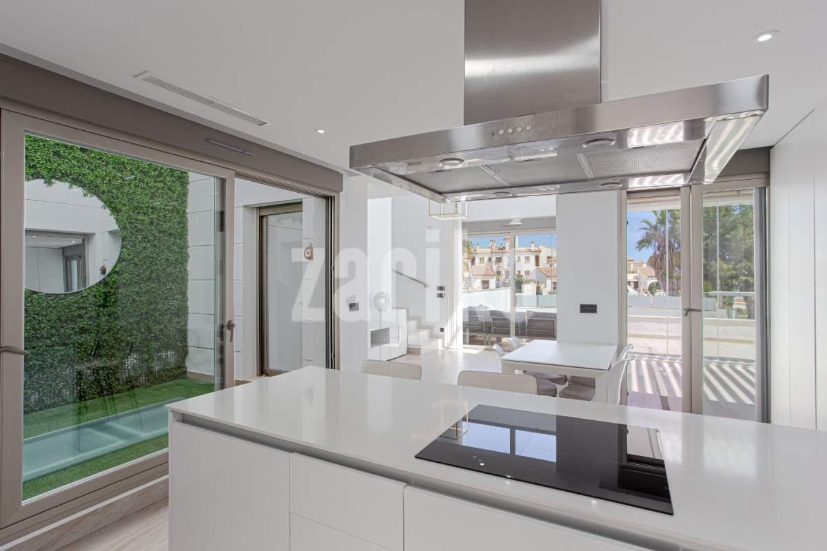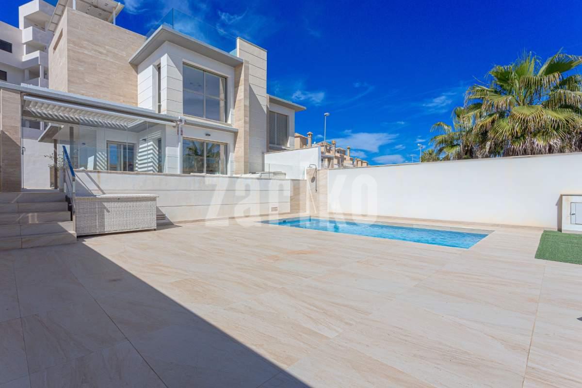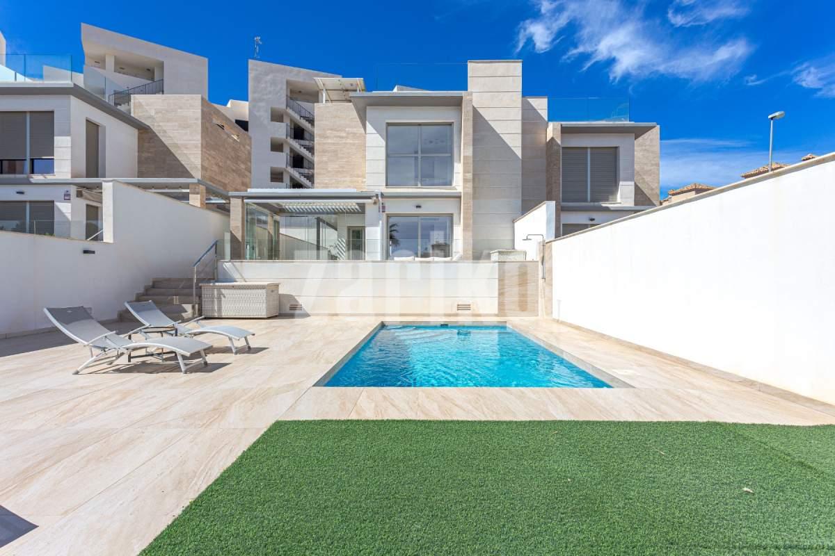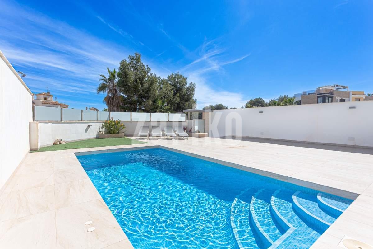 Moderna villa en venta en Villamartin, Orihuela Costa, construida en 2019, consta de 4 dormitorios, 3 baños, piscina privada, solárium y paneles solares. Con 150 m² de superficie habitable en una parcela de 320 m², esta propiedad ofrece una distribución espaciosa y elegante en tres niveles. La planta baja incluye un dormitorio y un baño con ducha a ras de suelo; En la planta superior encontrará dos dormitorios más, otro baño y acceso a una terraza soleada y solárium privado. El sótano ofrece versatilidad adicional con un cuarto dormitorio, un tercer baño y una amplia sala de estar. Esta villa orientada al sur está casi completamente amueblada e incluye una terraza bioclimática, estacionamiento privado y un gran espacio al aire libre ideal para relajarse o entretenerse. Eficiente energéticamente gracias a paneles solares, un sistema de baterías y una estación de carga para vehículos eléctricos, esta casa es ideal para un uso ecológico. Situada cerca de campos de golf, playas, colegios internacionales y todos los servicios, es ideal como residencia principal, casa de vacaciones o inversión de alquiler en la Costa Blanca. ¡No pierdas esta oportunidad! ¡Contáctanos hoy para concertar una visita!