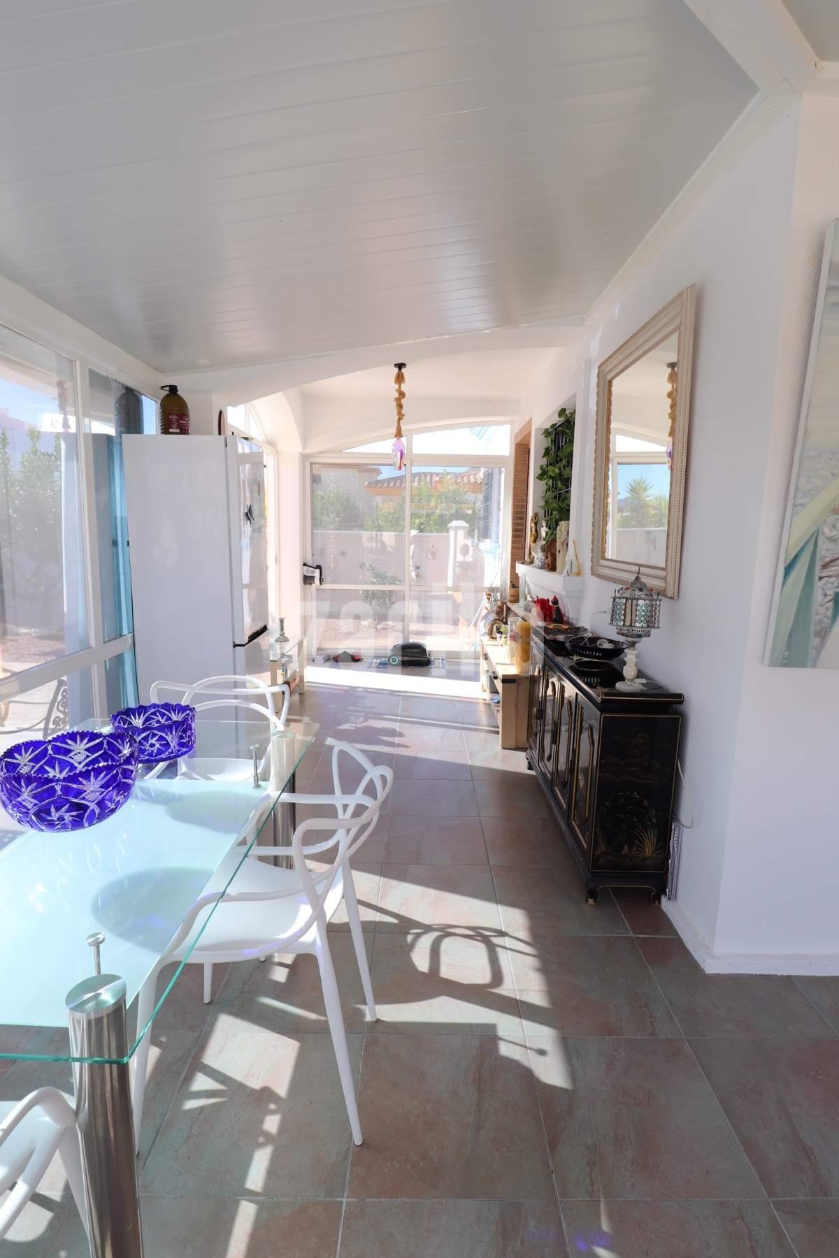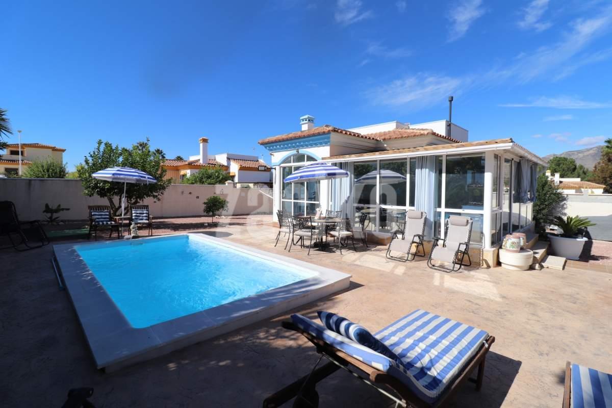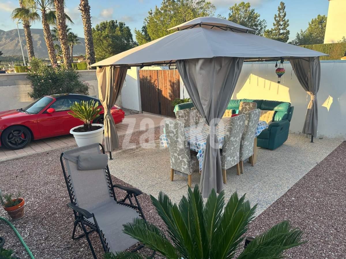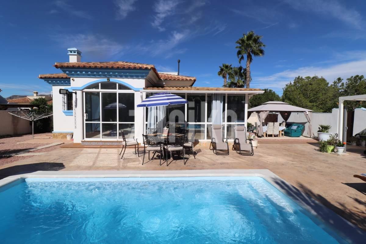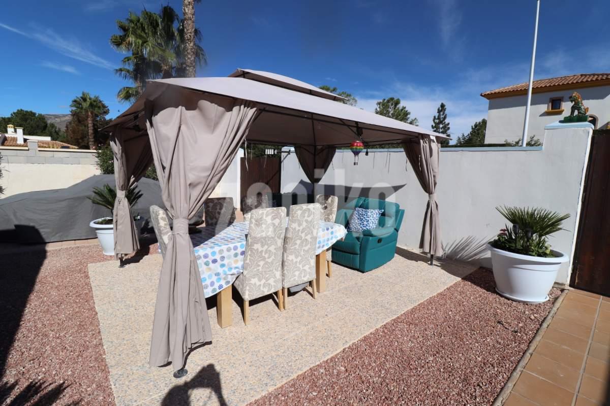 This beautiful villa in perfect condition is located in a very quiet residential area between the two villages of Hondon, with all amenities nearby. It comprises a spacious veranda overlooking the pool and garden, a living room with open-plan kitchen, two bedrooms and two bathrooms. A solarium offers superb views of the surrounding mountains. The garden has been carefully landscaped and features a swimming pool, several shaded terraces, a summer kitchen, parking for 2 cars, a garden shed and numerous flowers and fruit trees. The house will be sold fully furnished except for the television, garden furniture and water dispenser. 35 minutes from Alicante airport and the beaches.