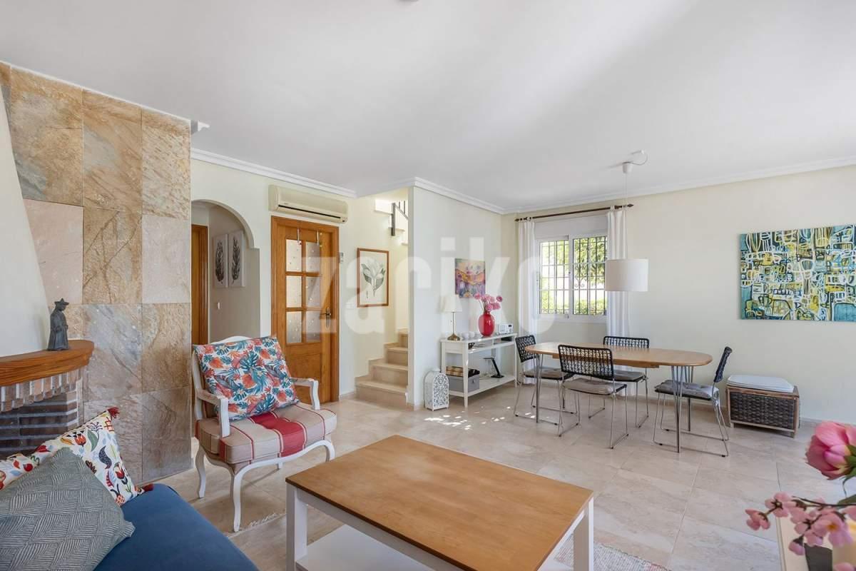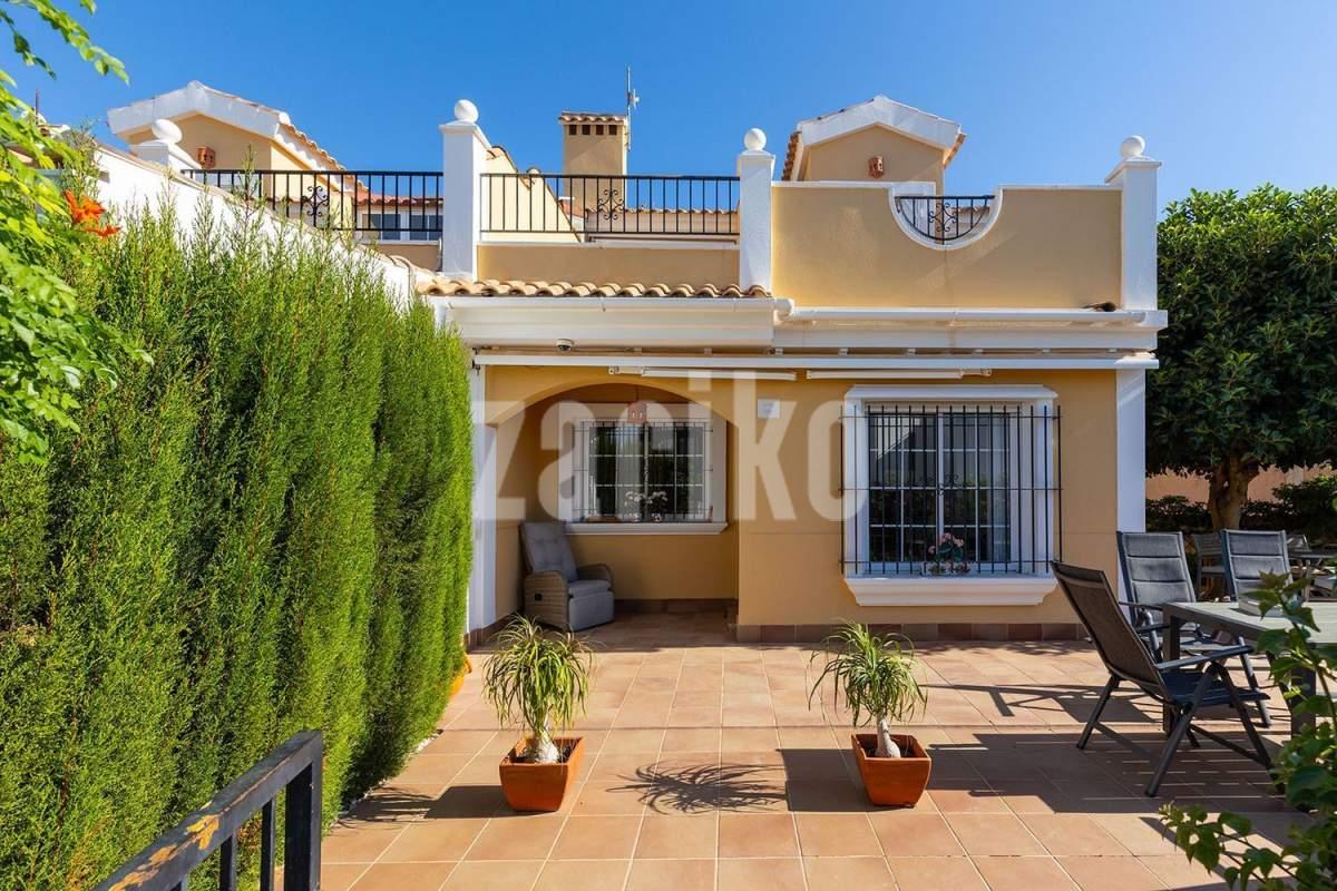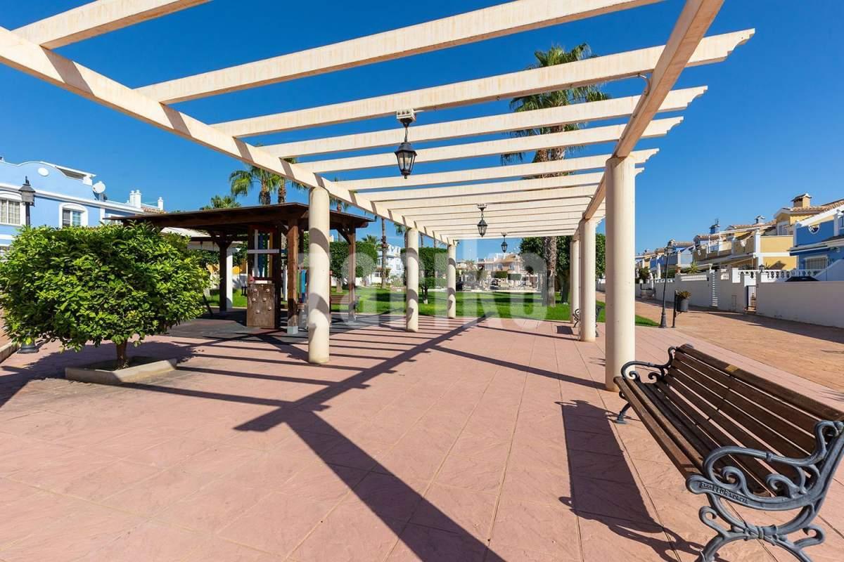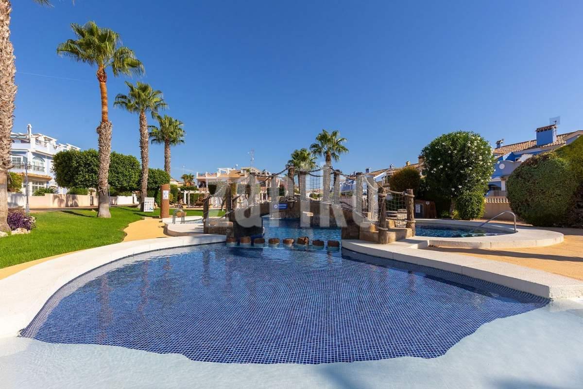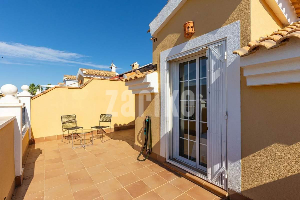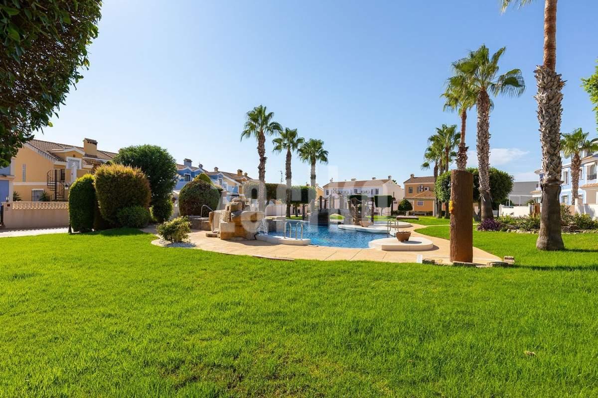 Una preciosa casa adosada en esquina situada en la popular zona de Lomas de Cabo Roig en la Costa Blanca Sur. Esta propiedad tiene una de las mejores parcelas de toda la urbanización, completamente orientada al sur, con espacio para construir una piscina privada si lo desea, y con numerosos árboles y plantas que la convierten en un verdadero oasis de tranquilidad e intimidad. La casa en sí cuenta con un amplio salón con chimenea y aire acondicionado, preparado tanto para el calor como para el frío. Hay una cocina independiente adyacente, así como un dormitorio y un baño con ducha en la planta baja. Desde la cocina se accede a un cuarto de lavandería y a través de éste a una terraza trasera, ideal para sentarse a la sombra durante los calurosos meses de verano. En la planta superior hay otros dos dormitorios y un baño. Ambos dormitorios tienen acceso al balcón con vistas a los alrededores e incluso un pequeño vistazo al mar Mediterráneo. Por la parte trasera de la propiedad se accede a las zonas comunitarias con preciosos jardines de césped natural que rodean una gran piscina con áreas para niños y adultos. También hay zonas de descanso sombreadas, un parque infantil y una sala social con tenis de mesa, lo que convierte a esta comunidad en una de las mejores equipadas de la zona. Lomas de Cabo Roig se beneficia del encantador nuevo centro comercial construido hace unos años, donde encontrará una variedad de restaurantes y tiendas de alta calidad. También hay un supermercado internacional en la zona, así como numerosos bares y otros servicios. A pocos minutos en coche se encuentran la playa, los campos de golf y el centro comercial La Zenia Boulevard. Para más información sobre la propiedad o para reservar una visita privada, póngase en contacto con nosotros en Mediter.