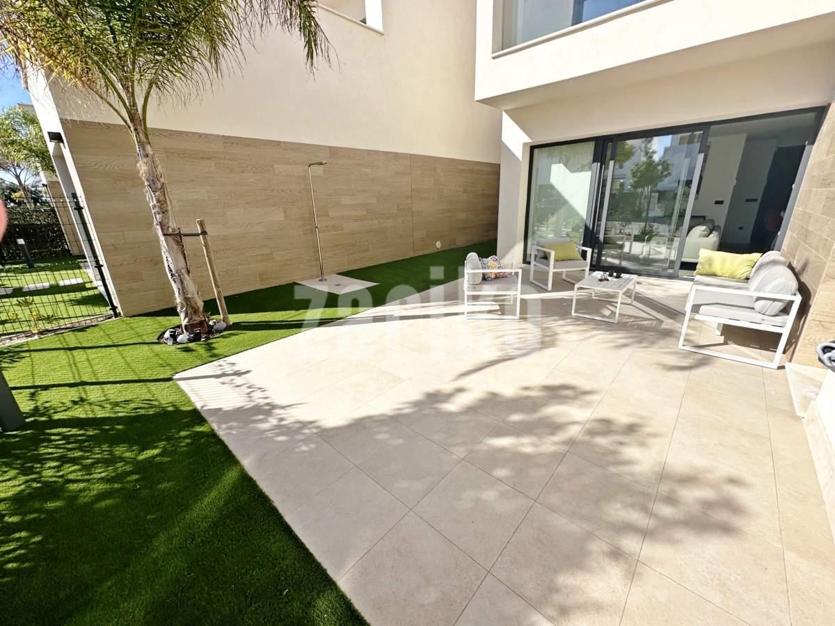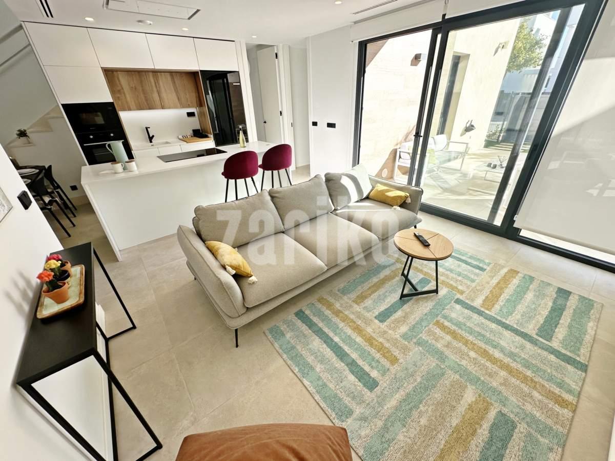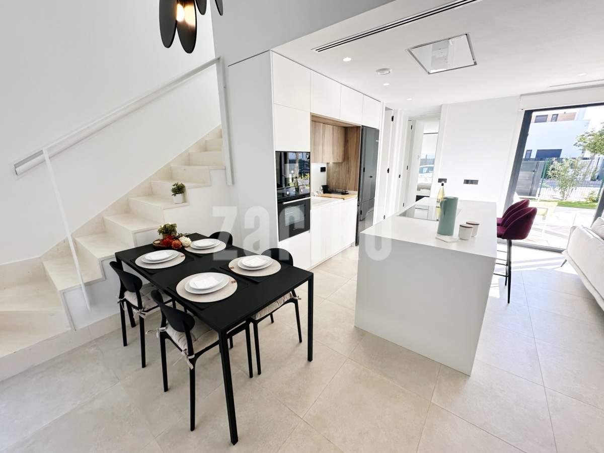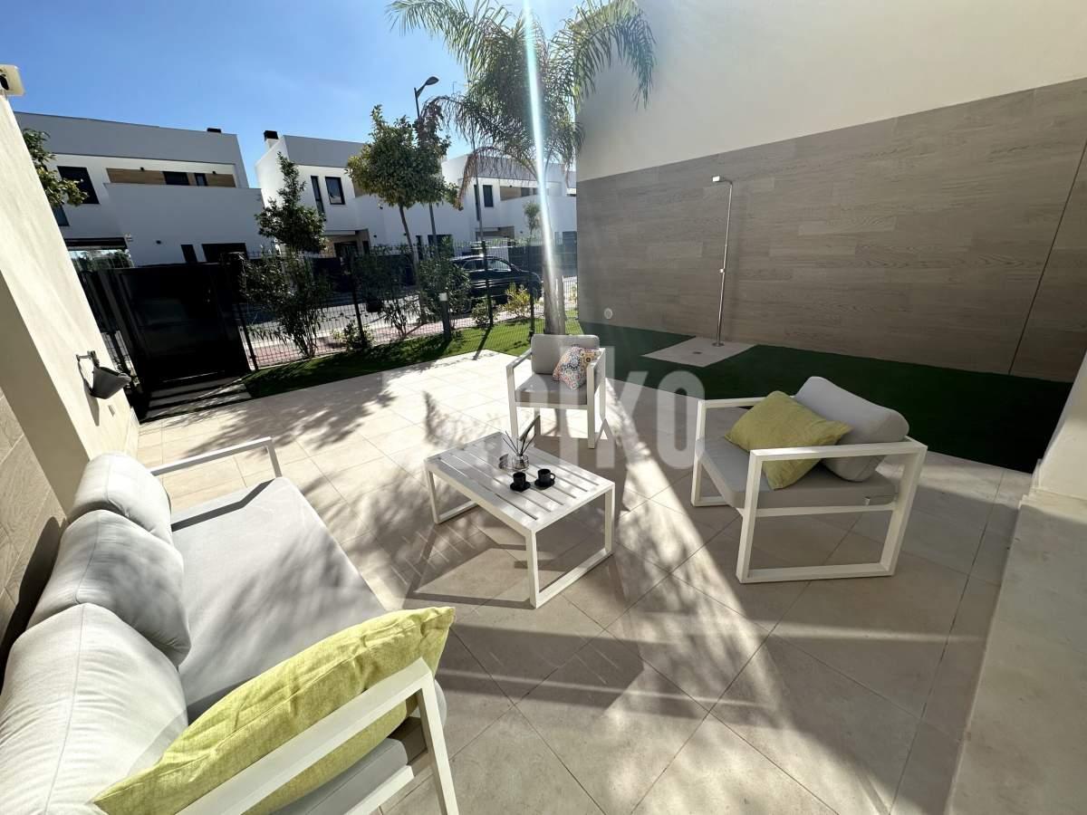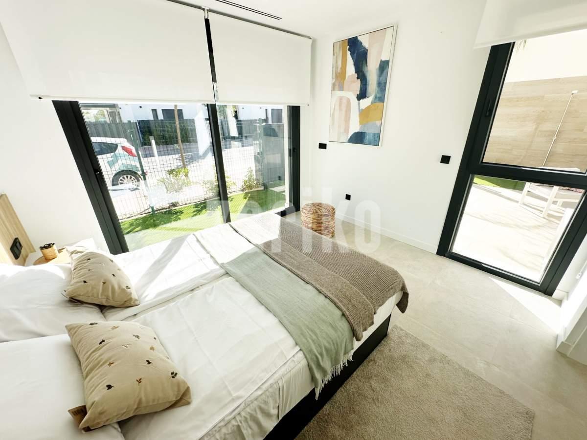 This beautifully designed villa features its own private driveway with convenient parking. There is the option to install a jacuzzi or swimming pool, allowing you to create a private outdoor relaxation area.The terrace adjoining the living room has been carefully designed to offer a peaceful, secluded space for relaxation. The villas themselves have been conceived with comfort, tranquillity and privacy in mind.Ideally located, the property is just a two-minute walk from the impressive lagoon and beach areas within Santa Rosalía Lake and Life Resort. The charming town of Los Alcázares and the beaches of the Mar Menor are only a five-minute drive away, offering a variety of popular Spanish restaurants such as Tropical and Encarnación.Inside, the home impresses with a wonderful sense of space and natural light – the dining area benefits from a double-height ceiling, while the lounge opens through large patio doors onto the terrace and garden. The modern kitchen includes a generous island with a breakfast bar and high-quality appliances. On this level there is also a practical utility room with a boiler and washing machine.The ground floor features a double bedroom with an en-suite bathroom and direct access to the garden, a second double bedroom with patio doors leading to the rear terrace, and a stylish family bathroom. The hallway also includes a useful built-in wardrobe providing additional storage space.Upstairs, the master bedroom offers a walk-in wardrobe, an en-suite bathroom and its own private terrace. From this floor there is access to a spacious south-facing terrace, shared between the master suite and the hallway.The villa is equipped with a solar installation for domestic hot water and 5 kW photovoltaic panels, significantly reducing energy costs. The Airzone system allows independent temperature control in each room – for both heating and cooling – ensuring year-round comfort.The kitchen features an elegant island finished with premium Porcelanosa – Krion worktop, made of a modern, durable and hygienic material inspired by natural stone. This worktop was added as an additional feature at the owners’ request.The interior has been carefully arranged with attention to material consistency and fine details. Wall-mounted lights in the bedrooms and the living-room pendant lamp were added at the owners’ request, reflecting a modern Spanish style with a subtly raw, stone-inspired character – resulting in a balanced and elegant atmosphere throughout.The property is sold fully furnished, has an A-class energy rating, Airzone climate control, an outdoor shower in the garden, and the option for quick completion – with no need to wait for a new construction phase.