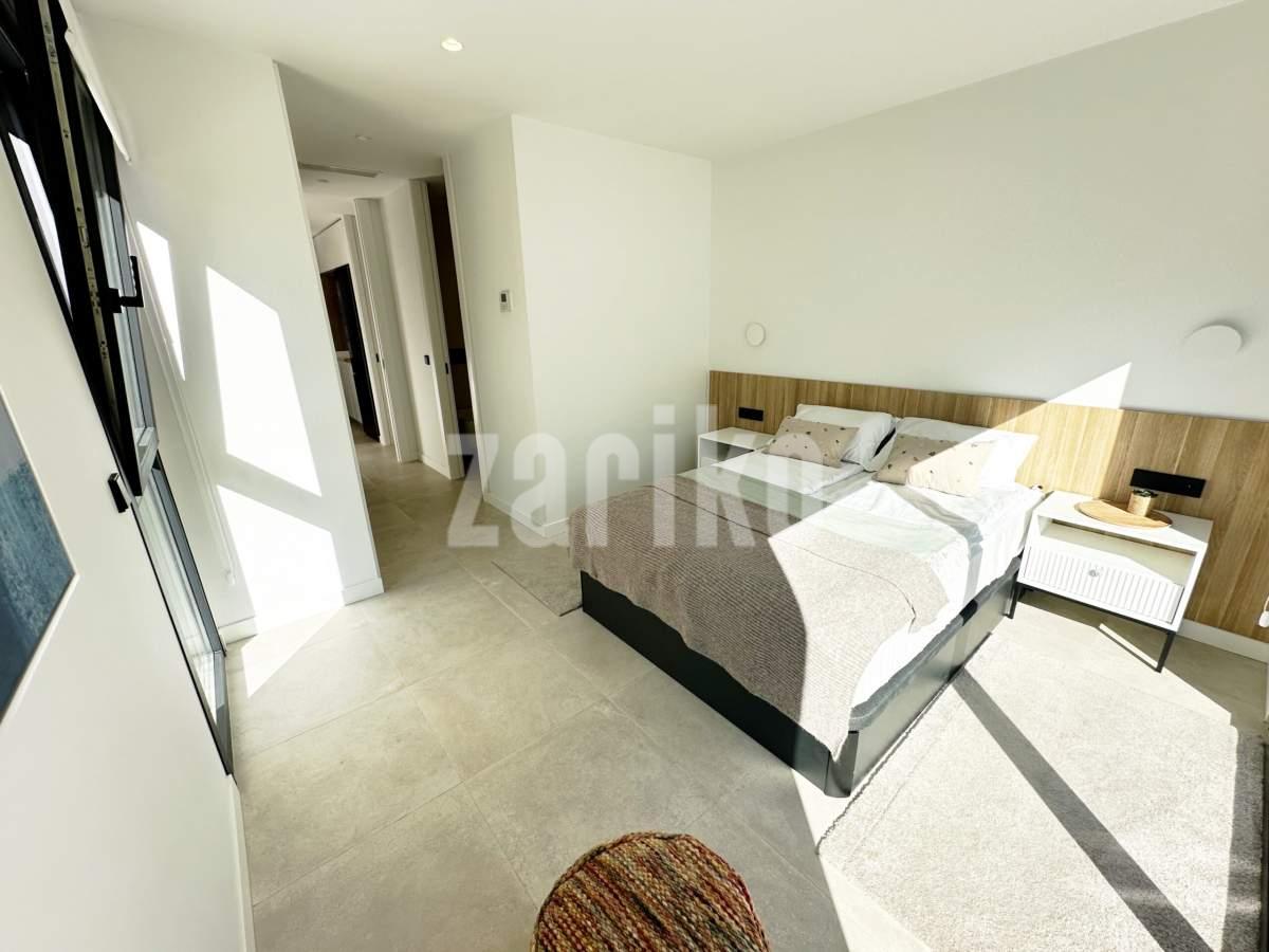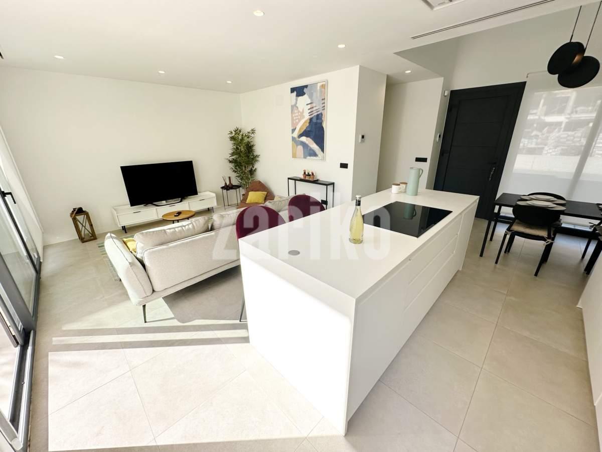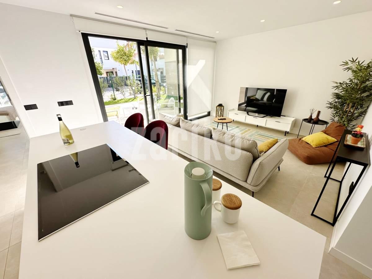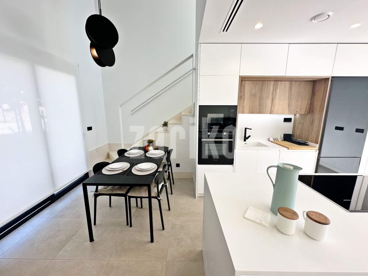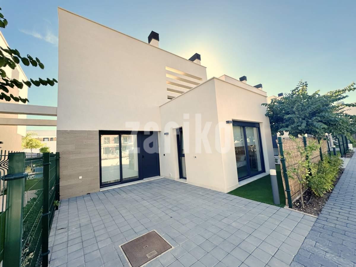 This beautifully designed villa features its own private driveway with convenient parking. There is the option to install a jacuzzi or swimming pool, allowing you to create a private outdoor relaxation area.The terrace adjoining the living room has been carefully designed to offer a peaceful, secluded space for relaxation. The villas themselves have been conceived with comfort, tranquillity and privacy in mind.Ideally located, the property is just a two-minute walk from the impressive lagoon and beach areas within Santa Rosalía Lake and Life Resort. The charming town of Los Alcázares and the beaches of the Mar Menor are only a five-minute drive away, offering a variety of popular Spanish restaurants such as Tropical and Encarnación.Inside, the home impresses with a wonderful sense of space and natural light – the dining area benefits from a double-height ceiling, while the lounge opens through large patio doors onto the terrace and garden. The modern kitchen includes a generous island with a breakfast bar and high-quality appliances. On this level there is also a practical utility room with a boiler and washing machine.The ground floor features a double bedroom with an en-suite bathroom and direct access to the garden, a second double bedroom with patio doors leading to the rear terrace, and a stylish family bathroom. The hallway also includes a useful built-in wardrobe providing additional storage space.Upstairs, the master bedroom offers a walk-in wardrobe, an en-suite bathroom and its own private terrace. From this floor there is access to a spacious south-facing terrace, shared between the master suite and the hallway.The villa is equipped with a solar installation for domestic hot water and 5 kW photovoltaic panels, significantly reducing energy costs. The Airzone system allows independent temperature control in each room – for both heating and cooling – ensuring year-round comfort.The kitchen features an elegant island finished with premium Porcelanosa – Krion worktop, made of a modern, durable and hygienic material inspired by natural stone. This worktop was added as an additional feature at the owners’ request.The interior has been carefully arranged with attention to material consistency and fine details. Wall-mounted lights in the bedrooms and the living-room pendant lamp were added at the owners’ request, reflecting a modern Spanish style with a subtly raw, stone-inspired character – resulting in a balanced and elegant atmosphere throughout.The property is sold fully furnished, has an A-class energy rating, Airzone climate control, an outdoor shower in the garden, and the option for quick completion – with no need to wait for a new construction phase.