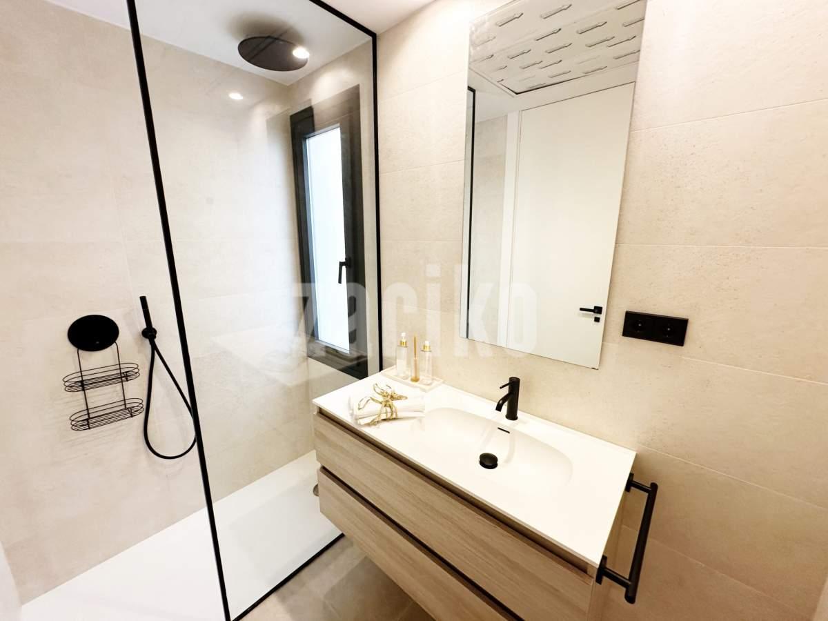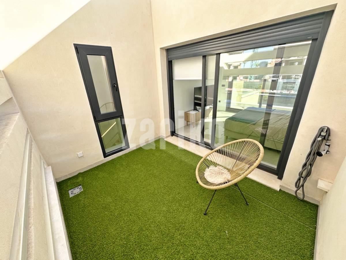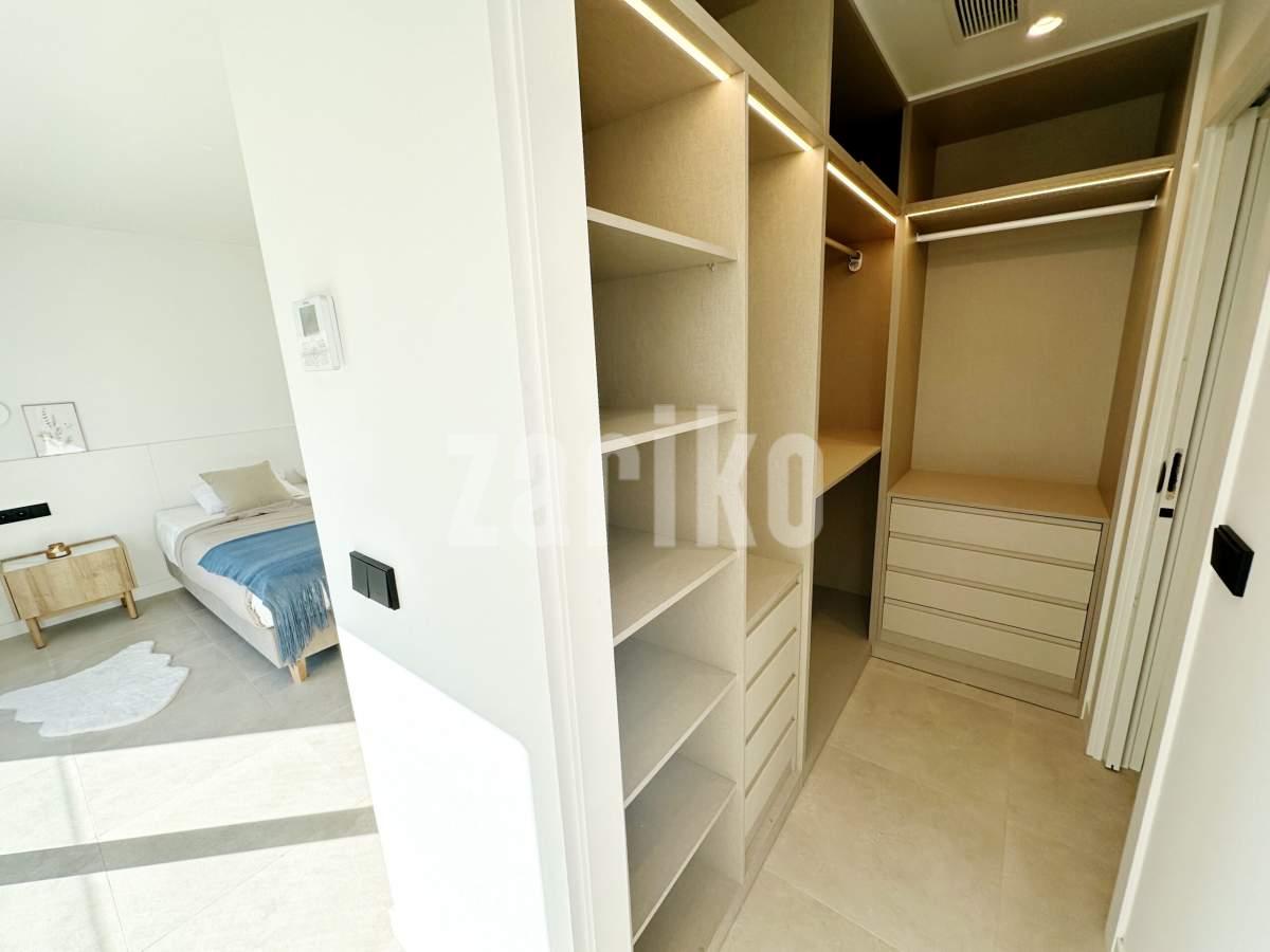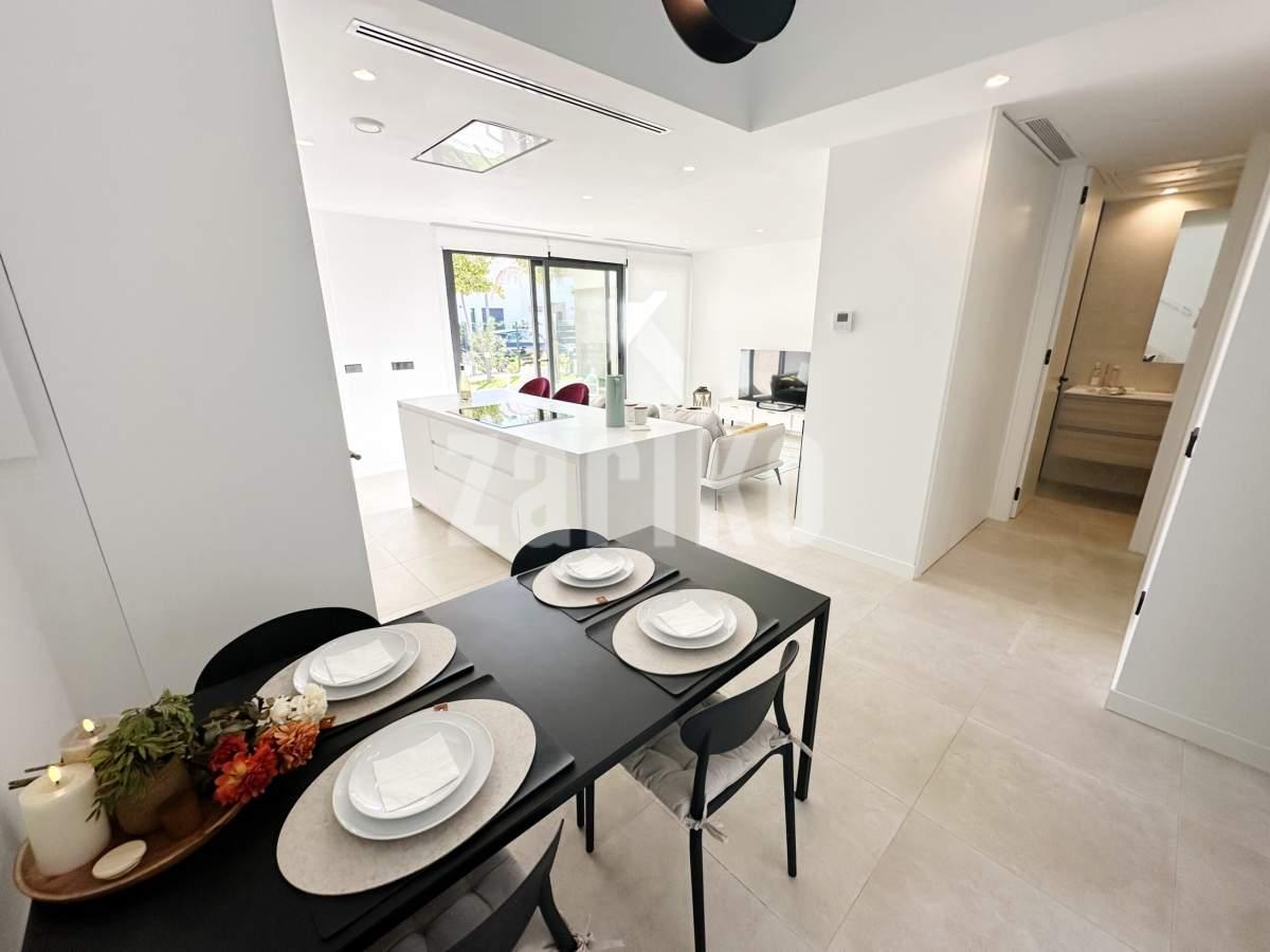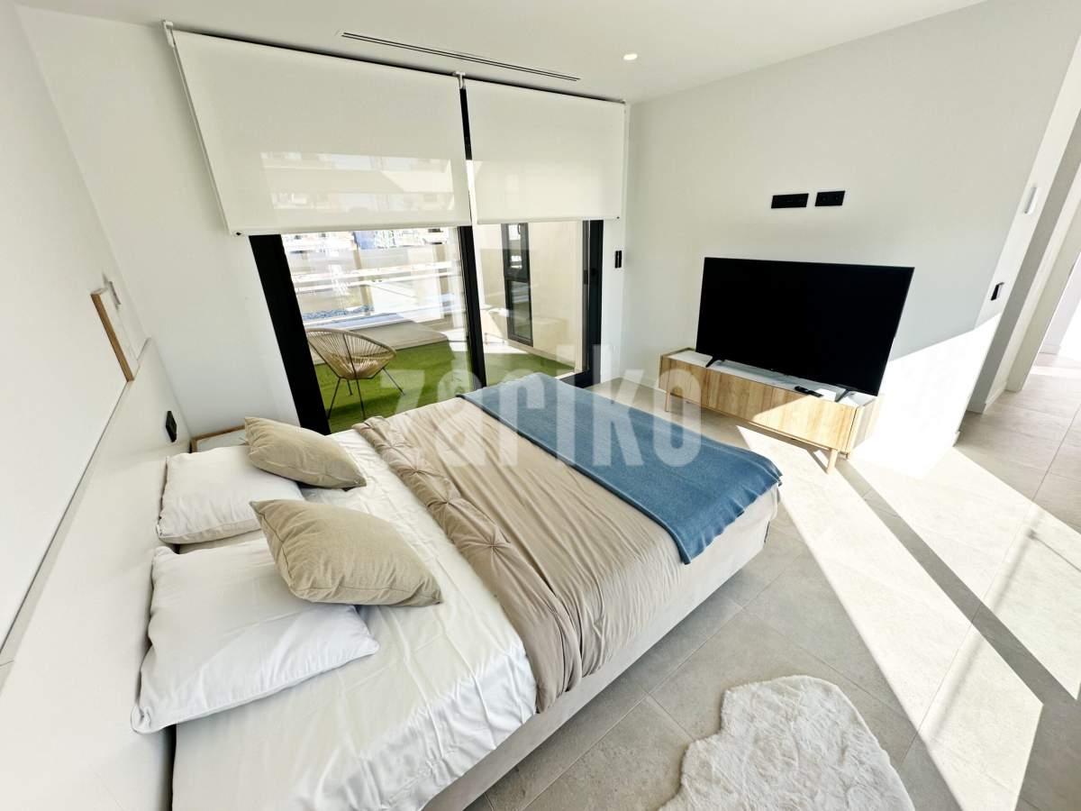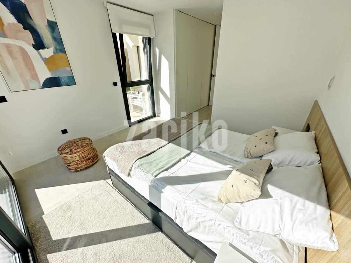 This beautifully designed villa features its own private driveway with convenient parking. There is the option to install a jacuzzi or swimming pool, allowing you to create a private outdoor relaxation area.The terrace adjoining the living room has been carefully designed to offer a peaceful, secluded space for relaxation. The villas themselves have been conceived with comfort, tranquillity and privacy in mind.Ideally located, the property is just a two-minute walk from the impressive lagoon and beach areas within Santa Rosalía Lake and Life Resort. The charming town of Los Alcázares and the beaches of the Mar Menor are only a five-minute drive away, offering a variety of popular Spanish restaurants such as Tropical and Encarnación.Inside, the home impresses with a wonderful sense of space and natural light – the dining area benefits from a double-height ceiling, while the lounge opens through large patio doors onto the terrace and garden. The modern kitchen includes a generous island with a breakfast bar and high-quality appliances. On this level there is also a practical utility room with a boiler and washing machine.The ground floor features a double bedroom with an en-suite bathroom and direct access to the garden, a second double bedroom with patio doors leading to the rear terrace, and a stylish family bathroom. The hallway also includes a useful built-in wardrobe providing additional storage space.Upstairs, the master bedroom offers a walk-in wardrobe, an en-suite bathroom and its own private terrace. From this floor there is access to a spacious south-facing terrace, shared between the master suite and the hallway.The villa is equipped with a solar installation for domestic hot water and 5 kW photovoltaic panels, significantly reducing energy costs. The Airzone system allows independent temperature control in each room – for both heating and cooling – ensuring year-round comfort.The kitchen features an elegant island finished with premium Porcelanosa – Krion worktop, made of a modern, durable and hygienic material inspired by natural stone. This worktop was added as an additional feature at the owners’ request.The interior has been carefully arranged with attention to material consistency and fine details. Wall-mounted lights in the bedrooms and the living-room pendant lamp were added at the owners’ request, reflecting a modern Spanish style with a subtly raw, stone-inspired character – resulting in a balanced and elegant atmosphere throughout.The property is sold fully furnished, has an A-class energy rating, Airzone climate control, an outdoor shower in the garden, and the option for quick completion – with no need to wait for a new construction phase.