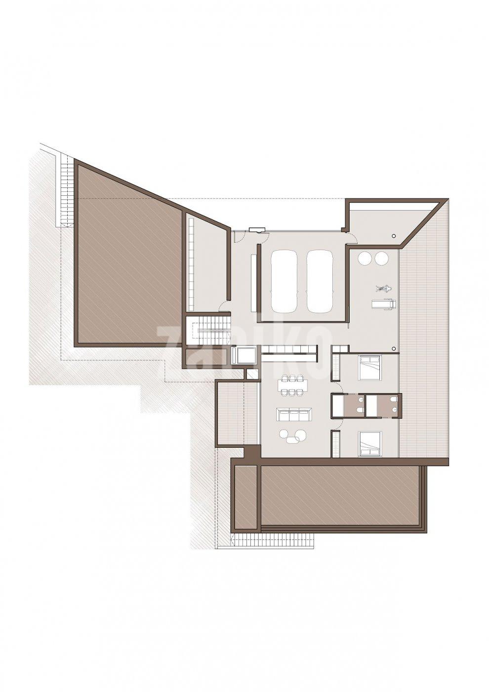 VILLA DE LUJO DE OBRA NUEVA CON VISTAS AL MAR EN MORAIRA Villa de lujo de obra nueva con vistas al mar en Moraira. La villa articula los espacios interiores a través de geometrías sencillas, puras y rotundas. Se accede a ella a través de una rampa y escaleras integradas en el terreno, apoyando la parte superior de la casa en un zócalo de piedra que da entrada a la vivienda. En la planta baja hay un garaje, un generoso vestíbulo de acceso junto a una gran bodega y un almacén y gimnasio. En la planta superior se encuentran las habitaciones principales de la casa, todas ellas con baño en suite y un gran espacio diáfano de más de 90m2 para albergar un espacio fluido de cocina comedor y salón en una vista panorámica de 180º del paisaje. Todo este espacio está rodeado por una amplia terraza, en cuya parte delantera cae un porche abierto de más de 50m2, proyectando hacia el exterior el interior de la casa y convirtiéndola en un espacio único. Una pieza geométrica única que proporciona unas impresionantes vistas del paisaje y que tiene de forma práctica y cuidada el programa y la funcionalidad del interior. La pureza geométrica y el diseño de la casa se traslada desde la composición arquitectónica hasta la ejecución del más mínimo detalle. Se han elegido soluciones técnicas y constructivas de última generación para trasladar a la vivienda las últimas novedades del mercado. Todo ello para conseguir una vivienda de lujo con las máximas prestaciones y con un diseño exquisito. Moraira es una pequeña ciudad con buenos restaurantes, bares y muchos supermercados alrededor. Hay una playa muy agradable justo al lado del pueblo que es ideal para las familias. El paseo marítimo ofrece unas vistas tremendas del Peñón de Ifach al otro lado de la bahía de Calpe. El camino de la costa de llegar allí es bien vale la pena hacer con algunas vistas espectaculares. Moraira situado a 1 hora 15 minutos al norte de la A7 desde el aeropuerto de Alicante es bastante fácil de llegar. Es aproximadamente la misma distancia o un poco menos al sur del aeropuerto de Valencia.