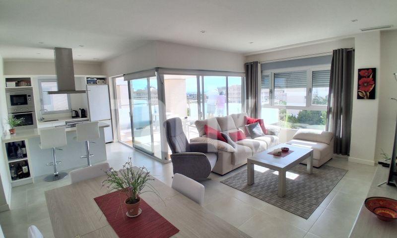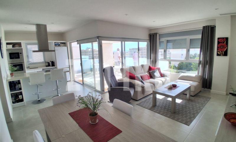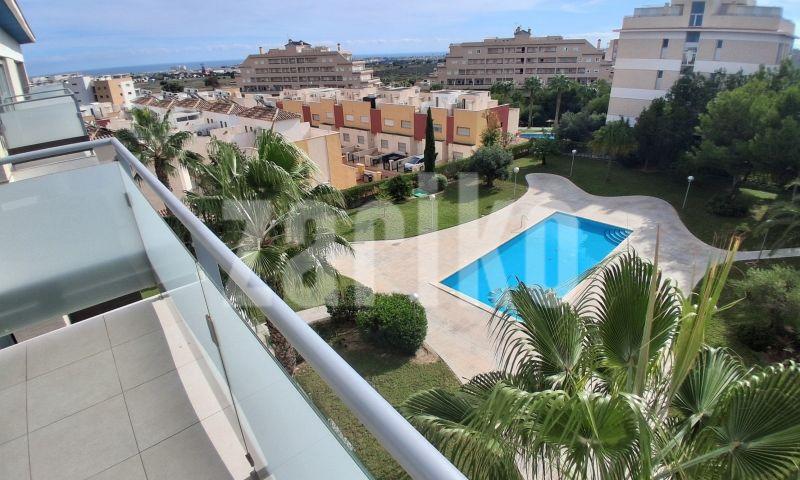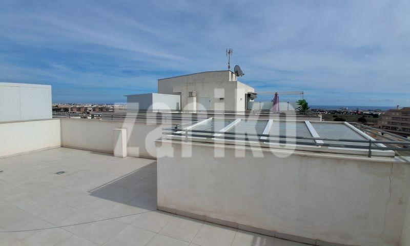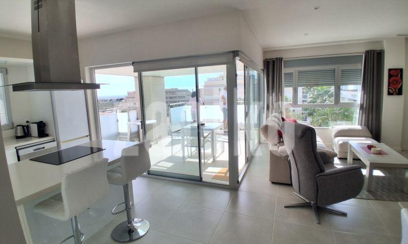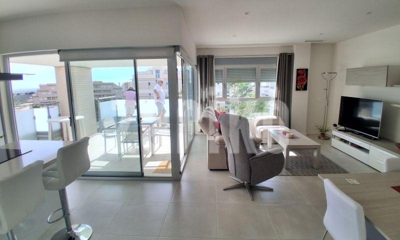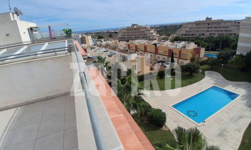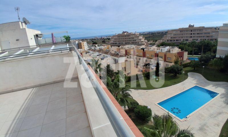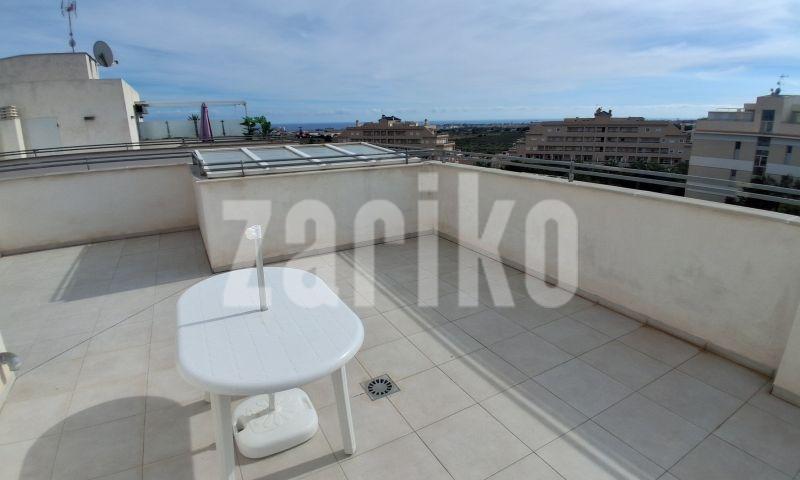 SPECTACULAR PENTHOUSE WITH TERRACE AND SOLARIUMSEA VIEWSNEXT TO ZENIA BOULEVARD MODERN DESIGNLocated in a very quiet residential area, within walking distance of all kinds of amenities, such as bus stops, supermarkets, pharmacies, and schools. It is less than a 10-minute walk from the Zenia Boulevard Shopping Centre, 3 km from La Zenia Beach, and 2 km from the Villamartin Golf Course.The property is located in a private, gated community with resident parking, a swimming pool, and gardens.This is a third-floor penthouse with elevator access. Entrance hall, double bedroom with ensuite bathroom, very spacious double bedroom, full bathroom, large living room with open-plan French kitchen and direct access to a terrace with views of the pool and the sea.South Facing. Very well maintained. Excellent investment.