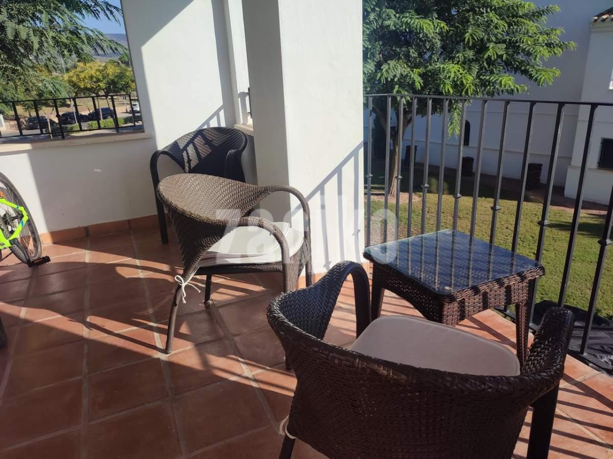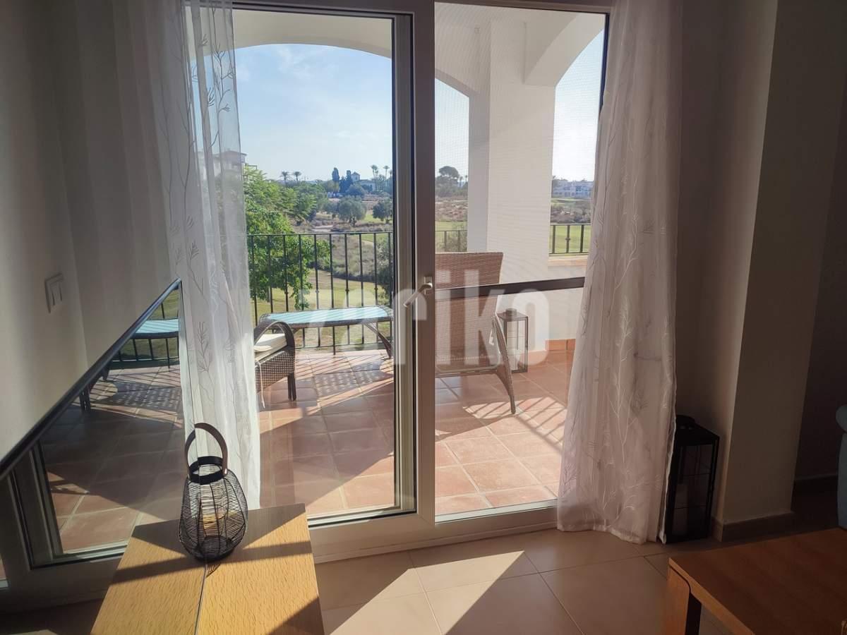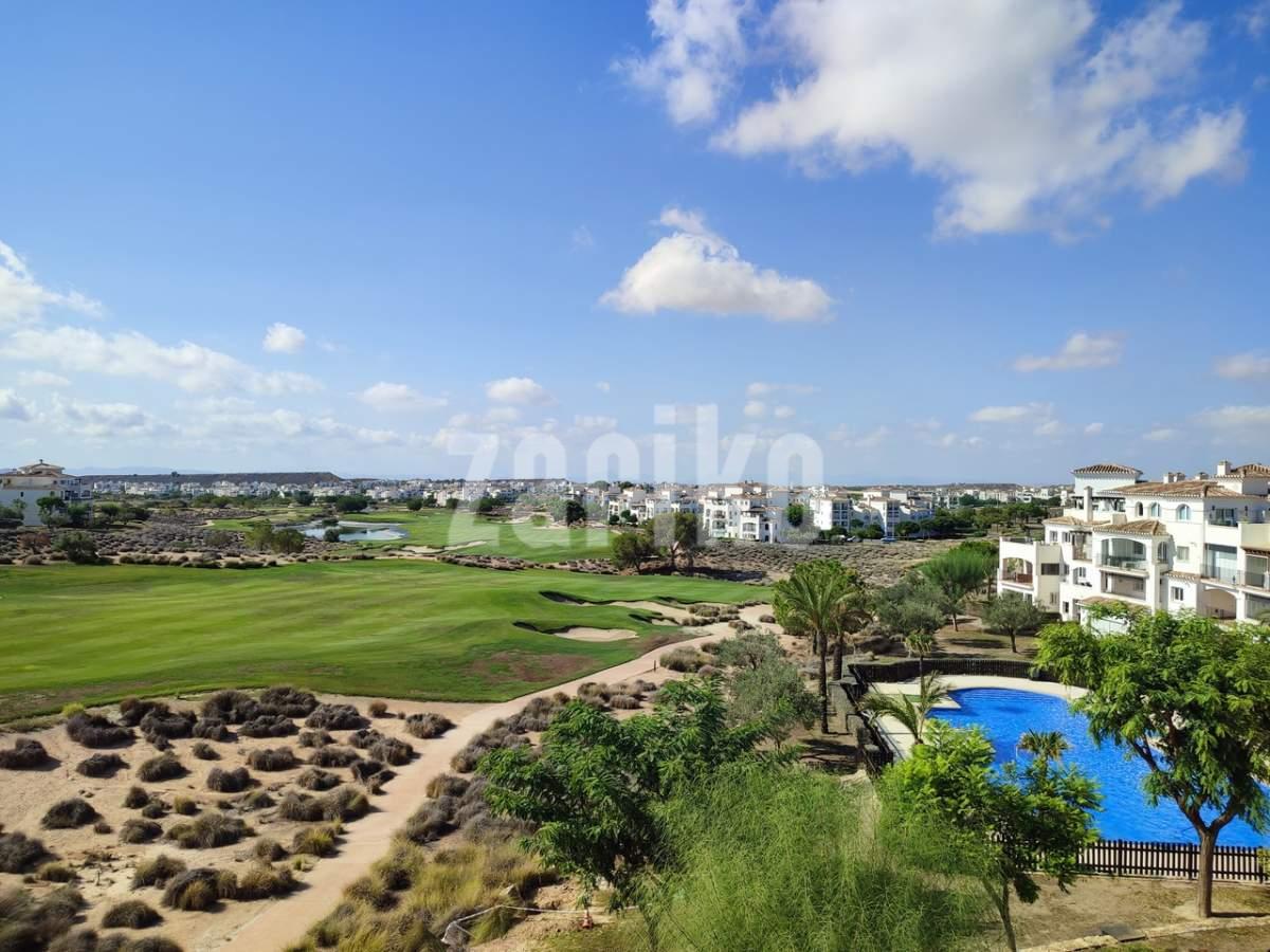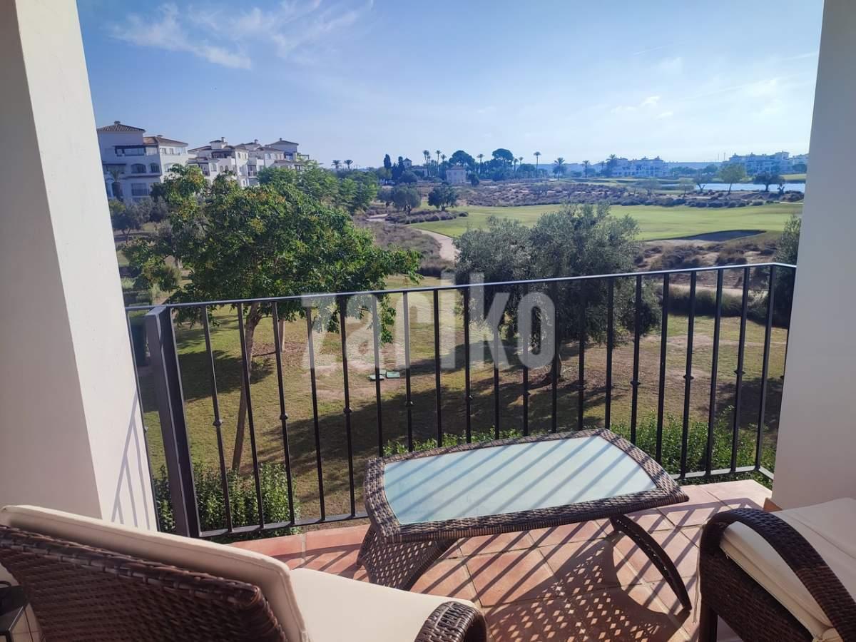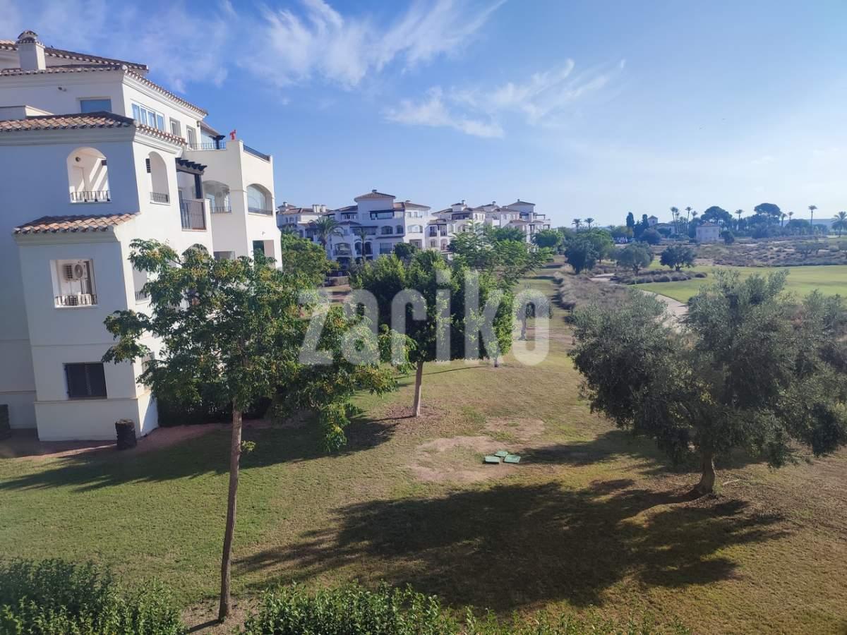 This corner apartment on the first floor has a sunny large terrace with sweeping views over the gardens, golf and lakes. It has a miodern walkin shower with a window. The apartment is being sold fully furnished minus personal possessions and also includes a private storeroom in the underground parking space.It would make an excellent holiday home or suitable for permanent living.The first thing that impresses you about Hacienda Riquelme Golf Resort is the wide-open spaces, the extensive gardens and the low-density construction, which create a relaxing environment to enjoy a very safe and peaceful life or holiday. The apartments are set out spaciously around the magnificent and challenging 18 hole golf course part of the Jack Nicklaus Golf Trail.All apartments have unlimited internet, air-conditioning for summer and heating for winter, private underground parking space and a communal lift.In the heart of the resort you will find the beautiful renovated Hacienda where you will find a supermarket, clubhouse, restaurant and bar. The inner court yard becomes the hive of entertainment in the Summer, whilst the large terrace set in the stunning gardens is open all year for “al fesco” dining and drinking.Facilities:Gated Community.24 hour security."El Cason" Bar, Restaurant, Clubhouse. "Sips" Coffee ShopSupermarket.Summer Entertainment.19 large community swimming pools.Communal gardens.Trees, 5 lakes.Wild flowers & local wildlife.Driving range & Golf ShopTennis courts.Paddle tennis courts.Football / Basketball court.Outside gym area.Children's play areas.Hacienda Riquelme is very well connected by the main motorways. Murcia Airport (20 mins)Mar Menor beaches (15 mins)Mediterranean beaches (20 mins)For those who like historical buildings, architecture or a desire to shop, the lovely cities of Murcia and Cartagena provide plenty of entertainment. Murcia (30 mins)Cartagena (45 mins) Murcia Airport (20 mins)Near to the bustling popular village of Sucina with shops, restaurants, bars, chemist, supermarket and lots more (5 minutes)For more information on the apartments available please contact us.