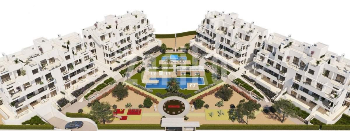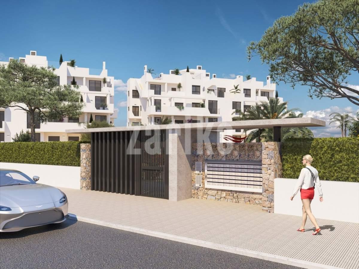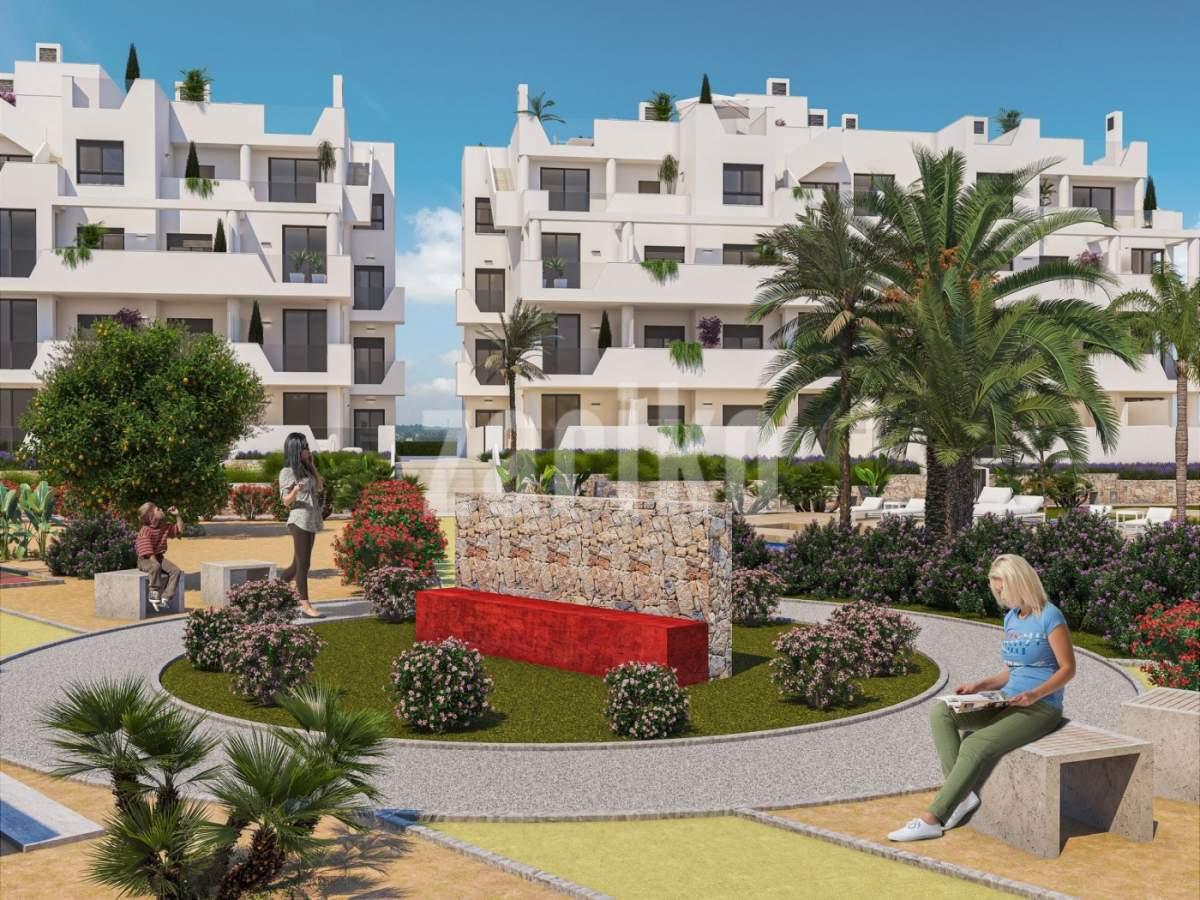 NEW BUILD RESIDENTIAL IN PRIVATE GATED RESORT IN PROVINCE OF MURCIA New Build residential complex has 60 apartments distributed in 4 blocks with terraced area for ground, first and second floors, community swimming pool, heated swimming pool and solarium with Summer kitchen on the penthouses, to enjoy all hours of sunshine every day of the year. The properties have 2 bedrooms and 2 bathrooms as well as parking space and storage room in the basement. These homes are designed with a contemporary style and open planned concept, comprising a fully-fitted kitchen and lounge-dining room. The properties will meet the highest standards and included: Kitchen completely furnished and equipped with oven and microwave in column, integrated fridge and dishwasher, induction hob and extractor fan. LED Lighting: inside the property (dining room, kitchen, corridors and bathrooms), and as well as in outdoor areas. Lined wardrobes with drawers. Motorised blinds in bedrooms. Heated floors in bathrooms. Fully fitted bathrooms with toilet, vanity unit, mirror, shower with rain effect and screen panels. Pre-installation for ducted air conditioning. Pre-installation of charging point for electric vehicles. Solarium with Summer kitchen, with pre-installation for electric appliances. Community swimming pool. Heated swimming pool. Parking space and storage room in the basement. Located in a private gated resort, with a main access entrance and 24 hours security. The resort is designed around an impressive 126.000 m2 green area. It comprises walking and cycling paths, sport facilities, paddle and tennis courts, a mini-golf course, gardens, dog parks, leisure areas, clubhouse…. Also in the central area is the jewel of the resort, a crystal-clear artificial lake of almost 17.000m2 of water surface, surrounded by white sandy beaches and palm trees, bringing a piece of the Caribbean to the Murcia Region. There are 2 islands in the lake, one of them has its own bar, there are also “beach Chiringuitos” spread around the lake. The resort is strategically located less than 4 km from the beach and the town of Los Alcázares, where you can practice various water sports, surrounded by several golf courses and the city of Cartagena less than 15 minutes by car and 22 km from Murcia airport, therefore having a wide cultural, gastronomic and sports offer within reach.