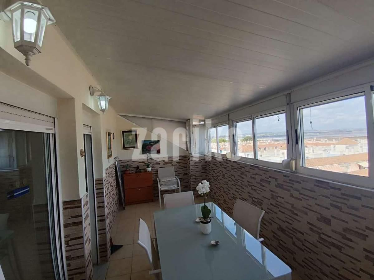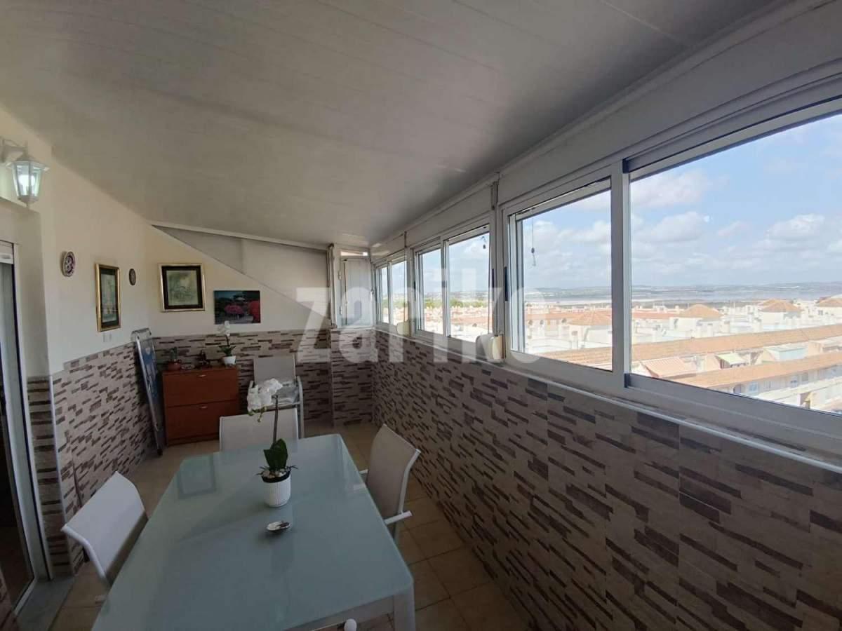 Penthouse with communal pool in Torrevieja. Very good condition, 5th floor with elevator. One bedroom with access to the 12m glazed terrace with views of the Torrevieja salt flats. Open-plan kitchen, living room with access to the terrace. Full bathroom. Furnished. 300m from the beach. Garage option for €11,000