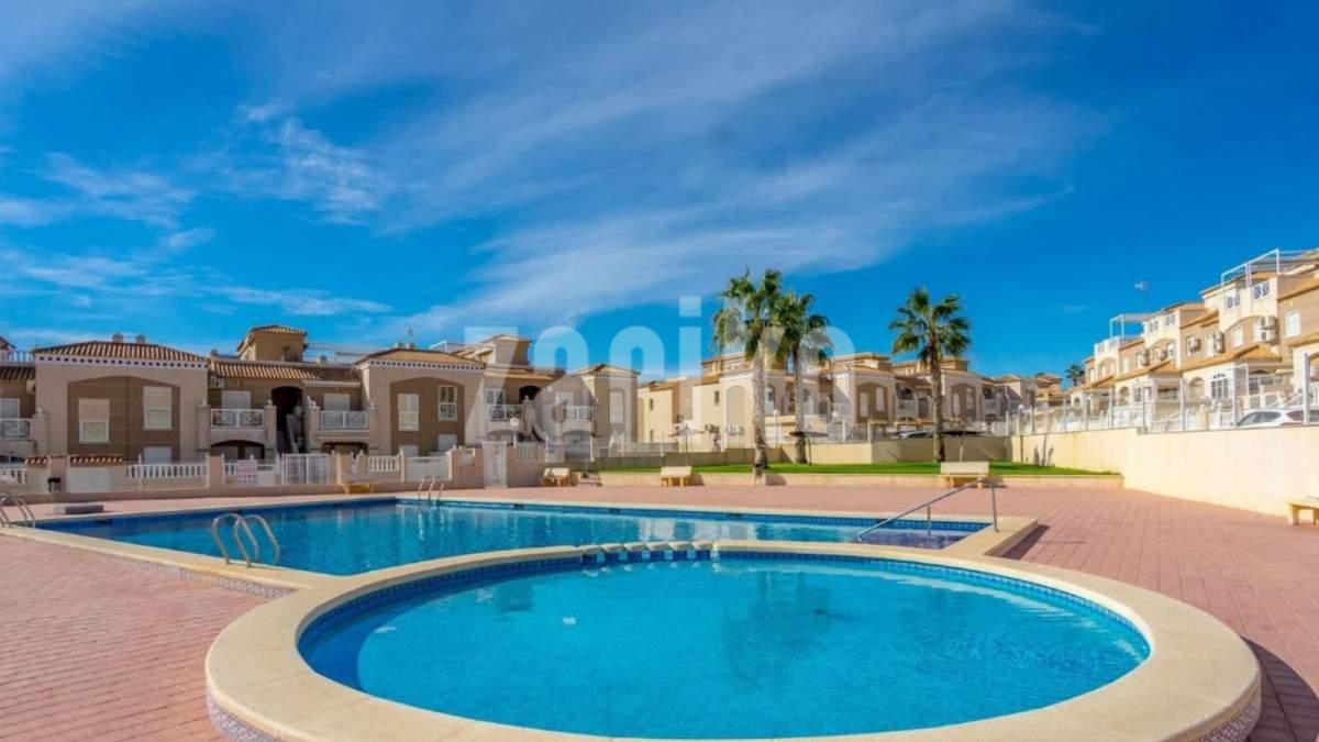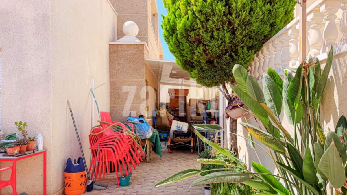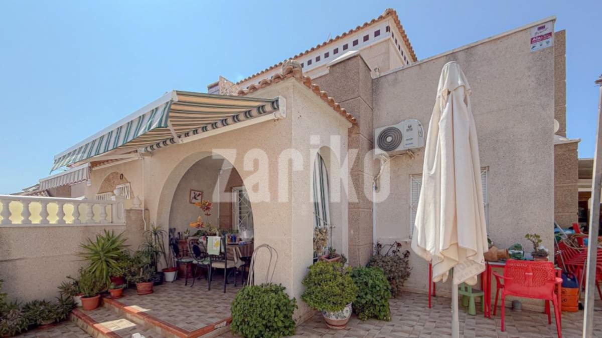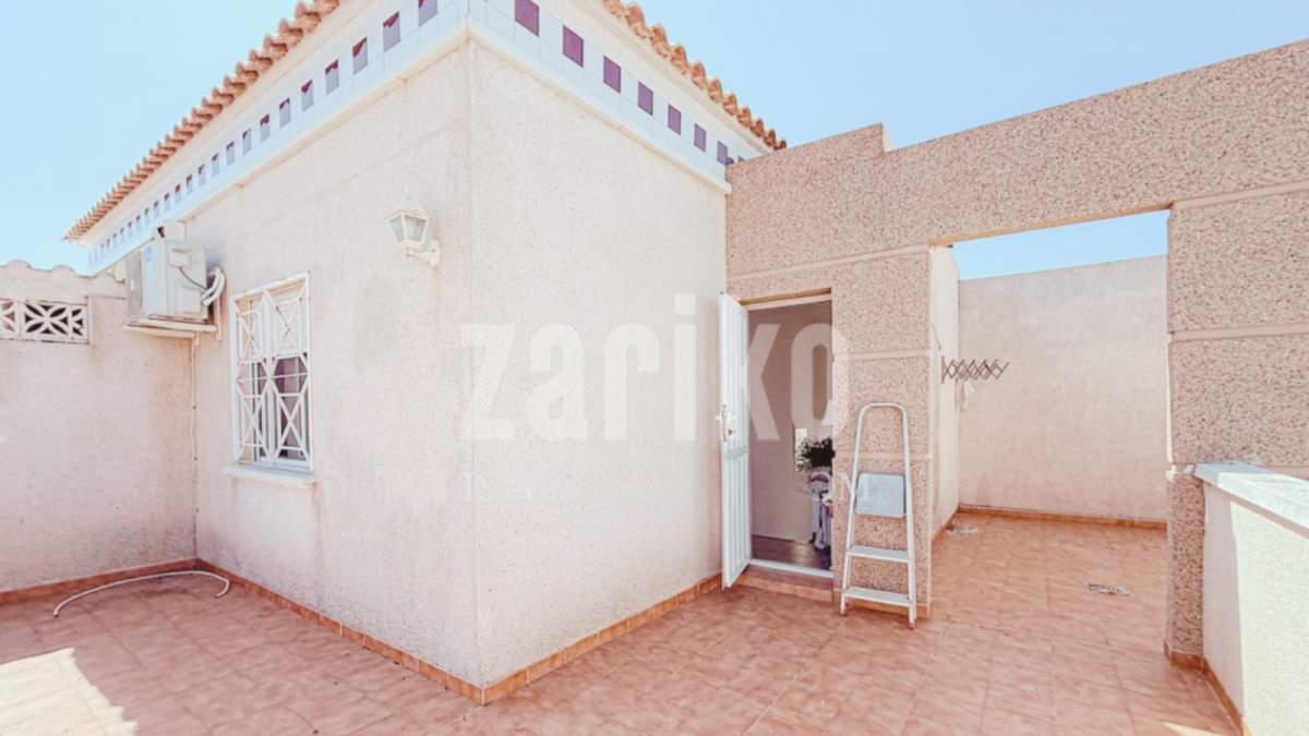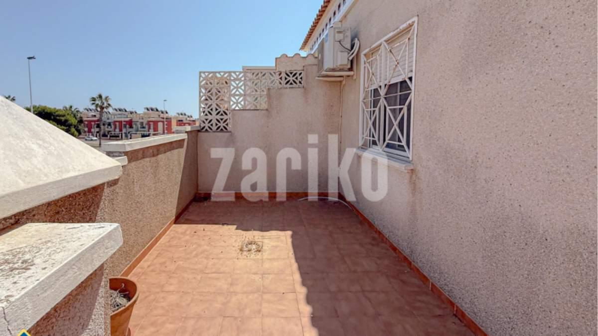 Townhouse in Aguas Nuevas, TorreviejaBeautiful semi-detached house with 101 m² built (80 m² usable), located just 650 meters from the beach. The property is distributed over two floors and offers 3 double bedrooms, 2 bathrooms, a fully equipped kitchen, and a bright living area.The home features oak interior carpentry, tiled floors, aluminum/climalit exterior windows, and northeast orientation. It is in very good condition and ready to move into.Extras include: air conditioning, built-in wardrobes, gallery, storage room, glazed terrace, private garden, community pool, solarium, high ceilings, and a parking space included in the price.Located in a well-connected residential area with bus services, medical centers, schools, supermarkets, parks, children’s play areas, and just steps away from the sea.