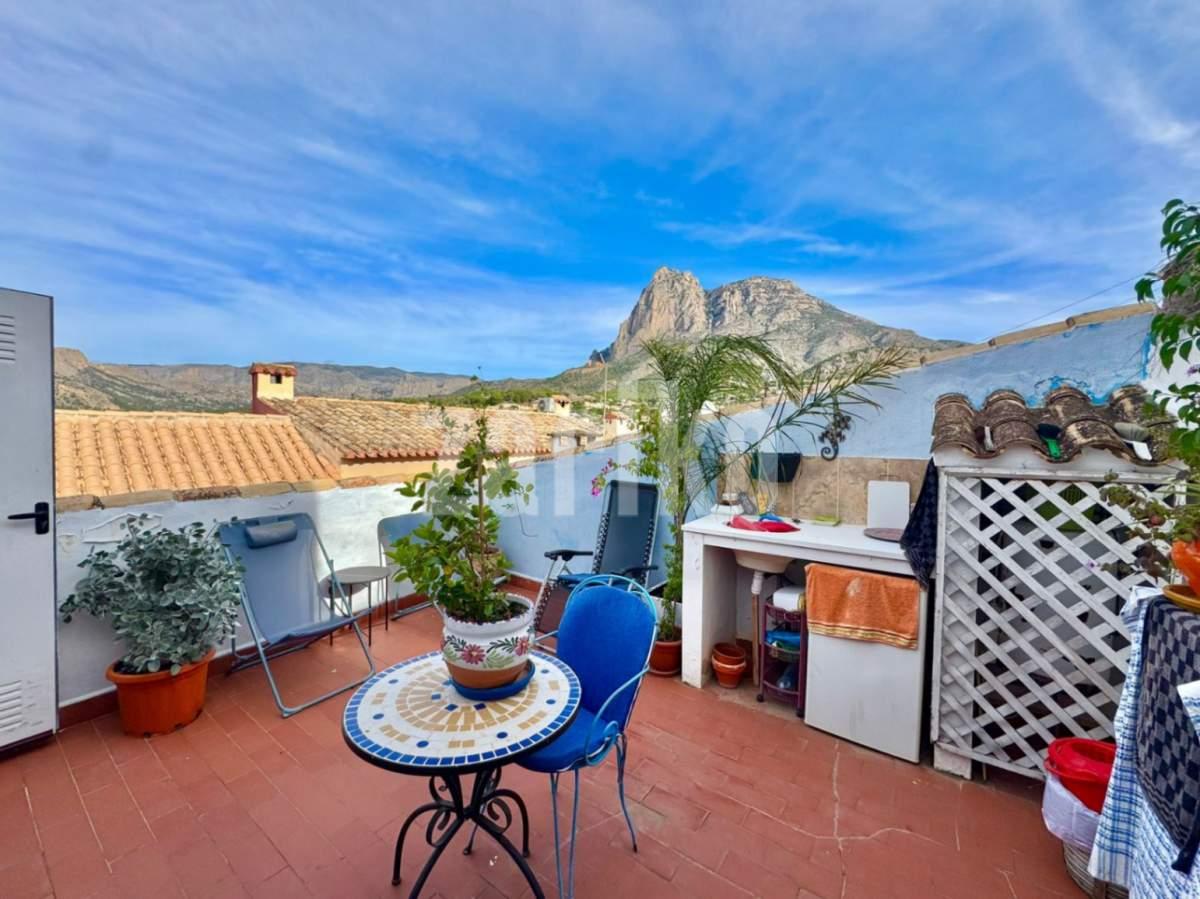 Charming townhouse in the heart of Finestrat Pueblo – 102 m² with mountain viewsDiscover this cozy and bright townhouse of 102 m² located in the picturesque old town of Finestrat, just a few steps from all amenities and with the unmistakable charm of a traditional village. The home is spread over three floors plus a private solarium with stunning views of the majestic Puig Campana mountain.On the main floor, the house offers a spacious living-dining area integrated with a fully equipped kitchen, ideal for enjoying a comfortable and practical lifestyle. A guest toilet and a charming inner courtyard complete this level, perfect for relaxing outdoors or sharing moments with friends and family.On the first floor, you will find two double bedrooms, a full bathroom, and a small terrace, providing brightness and natural ventilation to the spaces.The second floor houses a spacious open-concept bedroom, type suite, with its own bathroom, perfect as a master bedroom or even as a versatile space for guests, an office, or a relaxation room.Finally, the rooftop solarium offers a unique corner to unwind, with the possibility of installing a barbecue and enjoying panoramic views of Puig Campana and the charming village surroundings.A property full of character, ideal as a primary residence, second home, or an enchanting investment in one of the most beautiful villages on the Costa Blanca.