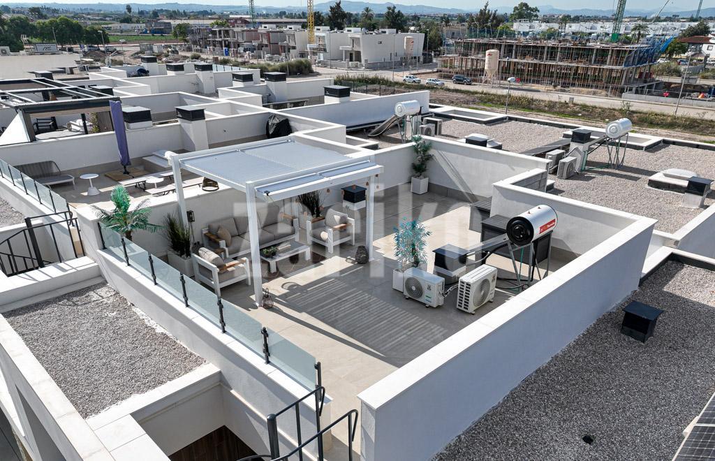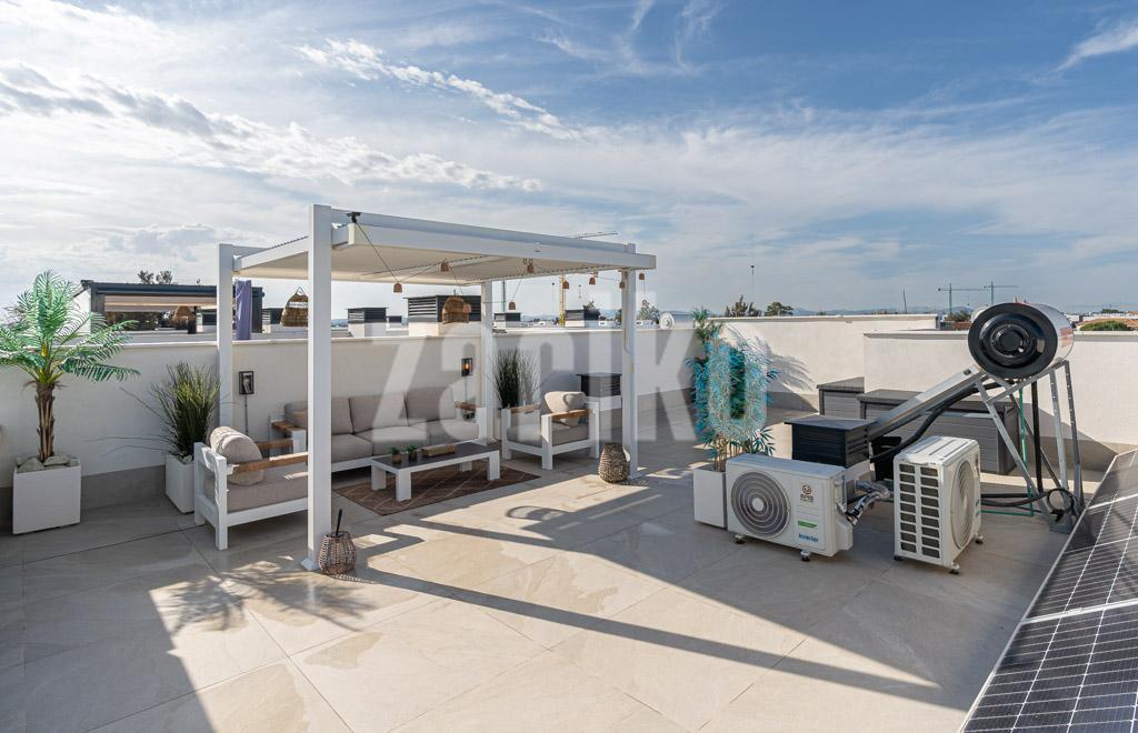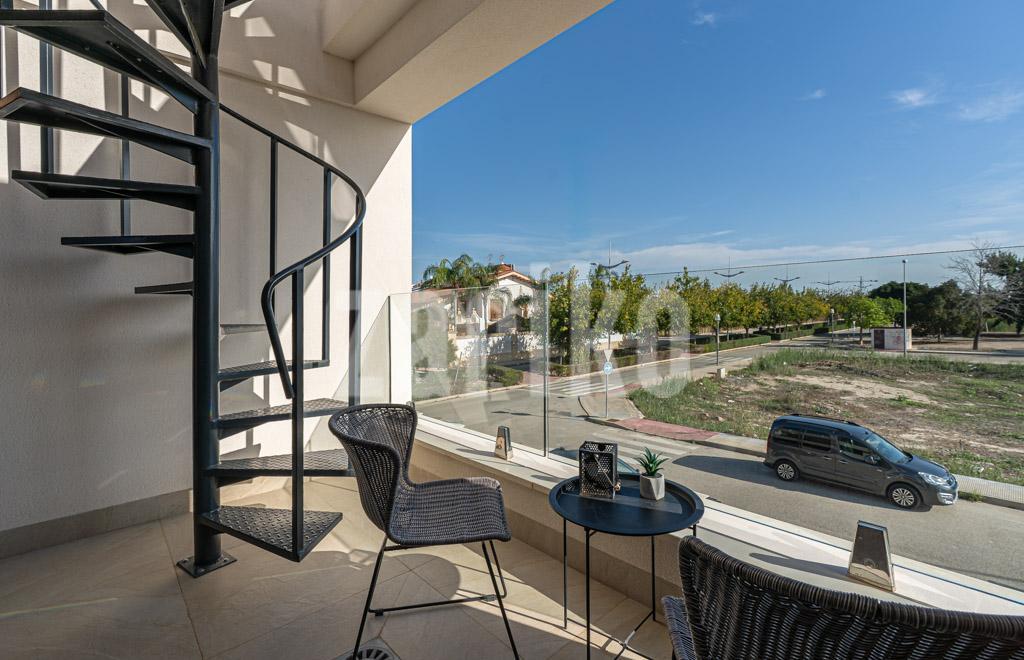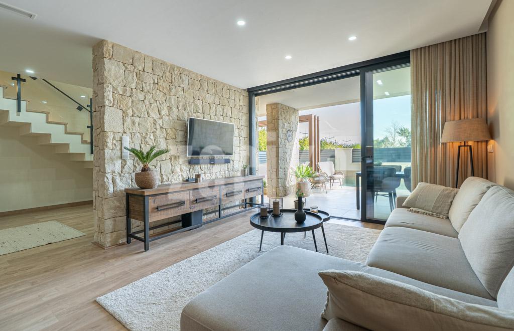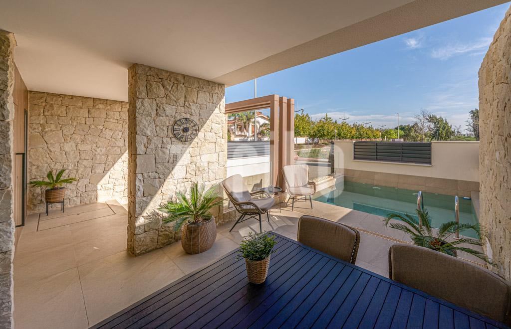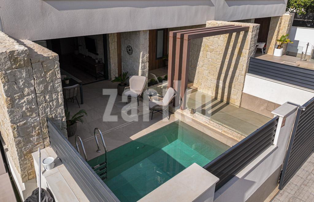 This terraced villa in Dolores is a warm and inviting resale home set within one of the most traditional towns of the Vega Baja. Designed over two floors and a solarium, it combines contemporary architecture with natural textures, creating a calm Mediterranean atmosphere from the moment you arrive. The outdoor spaces include a terrace and pool area located directly off the living room, creating a seamless indoor–outdoor connection, while a rear patio linked to the kitchen offers an additional corner for relaxed outdoor dining.The interior embraces a soft, welcoming style with a natural stone feature wall that mirrors the exterior finishes, complemented by wood-effect details that add warmth and character. The open-plan living, dining and kitchen area extends naturally towards the terrace and pool, making it ideal for everyday living as well as social gatherings. The master bedroom includes a walk-in wardrobe and an en-suite bathroom, while the remaining bedrooms and an additional bathroom are arranged to provide comfort and privacy. There is also a guest toilet on the main floor. The home is sold unfurnished, offering an opportunity to personalise the spaces, although the outdoor furniture is already included. Parking within the plot adds everyday convenience.Dolores is known for its friendly atmosphere, local traditions and complete range of services. It offers supermarkets, cafés, restaurants, sports facilities, parks and a weekly market that preserves the essence of a classic Spanish town. The surrounding countryside is ideal for cycling and leisurely walks, while the beaches of Guardamar del Segura are around 20 minutes away by car. Alicante Airport is approximately 30 minutes’ drive, and Murcia International Airport about 50 minutes, ensuring excellent connectivity for residents and visitors.