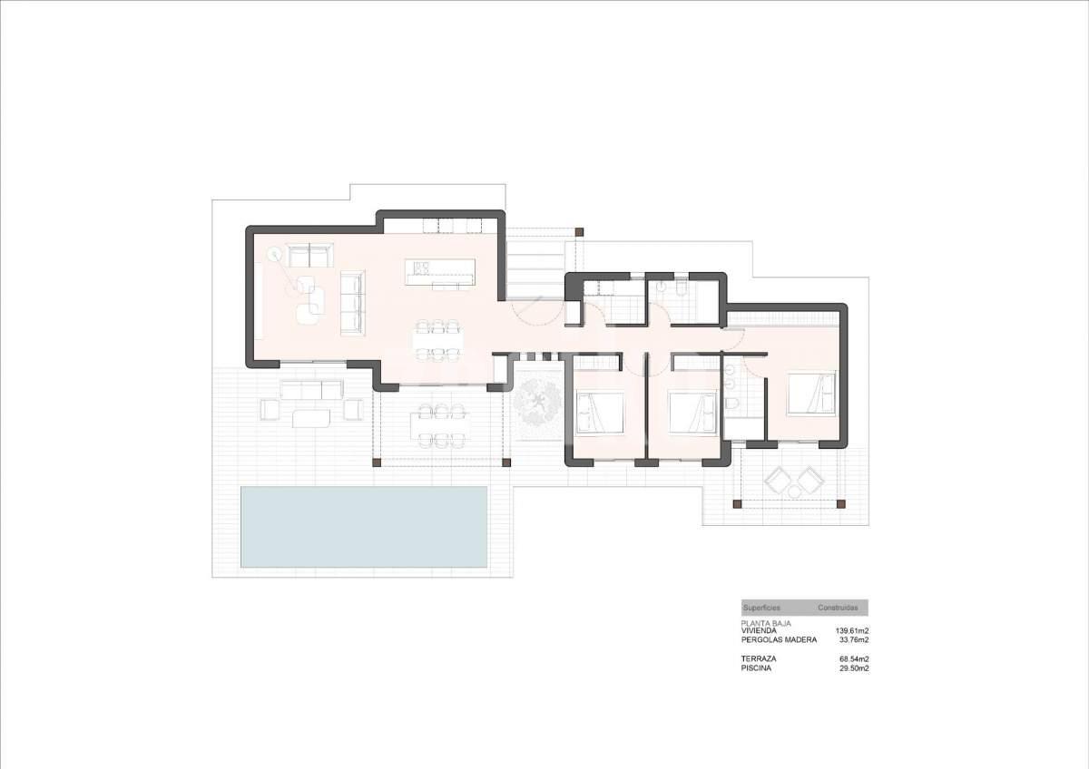 Mediterranean-Style Villas in La Fustera, Benissa Costa Exclusive New Build Villas in Northern Costa Blanca Discover an exceptional opportunity to own one of just four single-family homes in the prestigious area of La Fustera, Benissa Costa. These newly built villas perfectly blend Ibizan style and Mediterranean elegance, offering a peaceful lifestyle just 1 km from La Fustera beach and a short drive from Calpe, Moraira, and Benissa. Single-Level Living on Spacious Plots Each villa is designed for comfort and convenience, featuring: 3 bedrooms and 2 bathrooms on a single level Living area of 139.61 m² with open-plan layout Private plots over 800 m², providing ample outdoor space Large terraces (68.54 m²) with shaded pergolas Private swimming pool (29.50 m²) ideal for sun-soaked days The homes are carefully positioned to ensure privacy and tranquility, surrounded by lush vegetation that creates a true Mediterranean retreat. Architecture Inspired by Ibiza With clean lines, cubic volumes, and the use of natural materials such as wood and stone, the design reflects the serene and sophisticated character of Ibiza. Every element has been crafted to integrate harmoniously with the environment, creating a warm and timeless atmosphere both inside and out. Comfort and Energy Efficiency The villas are built to the highest standards, using energy-efficient construction techniques and quality finishes throughout. Spacious and bright interiors flow seamlessly to the exterior terraces, allowing you to enjoy the Mediterranean climate all year round. Strategic Location Close to All Essentials Located in a low-density residential area, this development offers the perfect balance between nature and accessibility. Nearby points of interest include: La Fustera Beach – 1 km Calpe, Moraira, and Benissa town centres – 8 to 10 km Club de Golf Ifach – 7 km Marina of Moraira – 8 km Alicante Airport – 84 km La Marina Shopping Centre (Ondara) – 35 km Your Ideal Mediterranean Home Awaits Whether you are searching for a permanent residence, holiday escape, or investment property, these villas in La Fustera offer an unbeatable combination of location, quality, and design. Contact us today to learn more or arrange a viewing of this exclusive development.