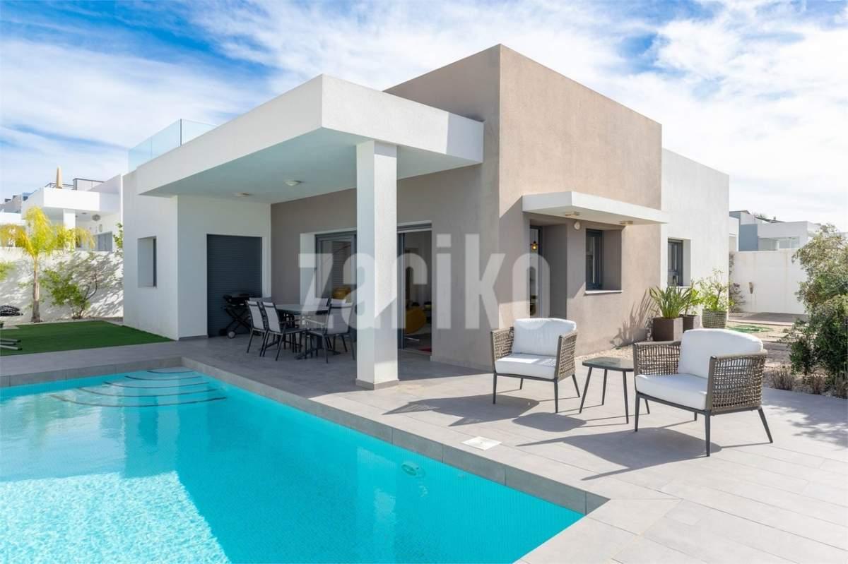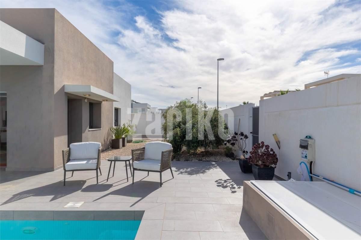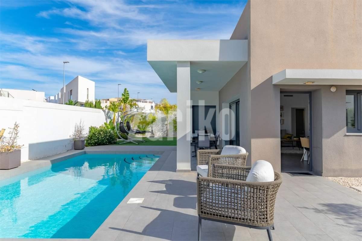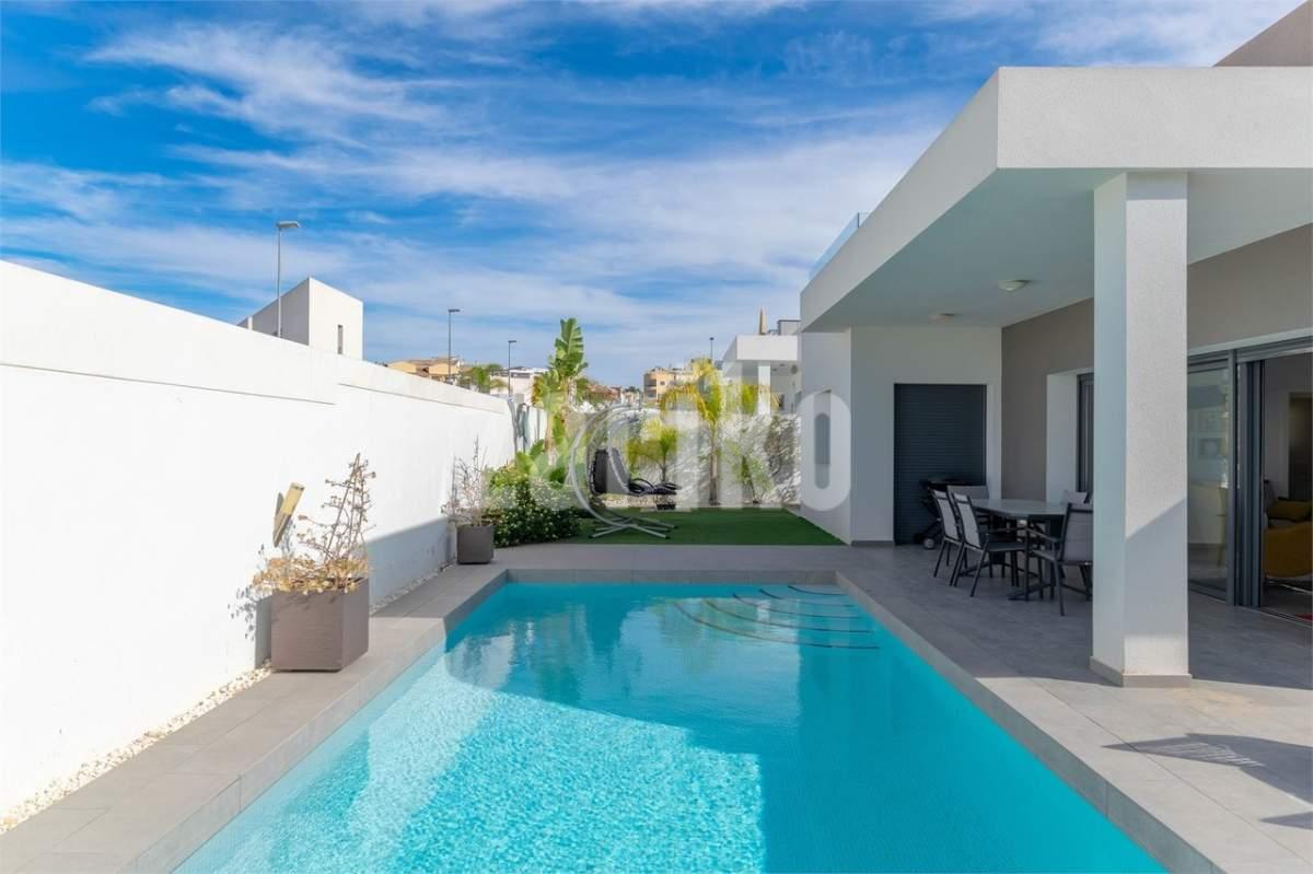 Stunning south facing corner detached villa with 3 bedrooms in Benijofar, Alicante. Within a 5 to 10 minute walk of the town centre or even Benimar where you can find a huge selection of amenities and facilities, and the nearest beaches are only a 10 minute drive away at Guardamar del Segura. The property is furnished and equipped to a very high standard and was built in 2016 by one of the top builders in the area. On entering the property you have an entrance hall with wardrobes giving plenty of storage space, an open plan fully fitted kitchen, a separate utility room, a spacious lounge/dining room with large sliding doors out to the garden, partly covered terrace overlooking the private garden and private swimming pool, three double bedrooms, the master with en suite shower room, all bedrooms come with fully fitted wardrobes and have direct access to terraces or the garden, and a family shower room. The property also boasts full air conditioning and under floor heating in the bathrooms.Outside is a beautifully landscaped garden, low maintenance with tiled, gravelled and artificial grassed areas, irrigation system, off road parking, private swimming pool with large patio areas having plenty of space for seating and sun bathing areas and the added bonus of raised walls to give you the added privacy on your plot.Benijofar is one of the villages that makes up the Vega Baja area on the Costa Blanca. It is a lovely village with a charming church and an attractive square/plaza. In Benijofar there are a lot of places to visit, for instance the Casa de Cultura where concerts and shows take place all year round. There is also a marked walking trail which includes the Rio Segura and an outdoor swimming pool. In Benijofar you can also find a walking and cycling route and the three crosses viewpoint. If you are a nature lover, you must visit the Cañada Marsa Park and El Secano Park. These two places are located in the commercial area of Benijofar, called Benimar.