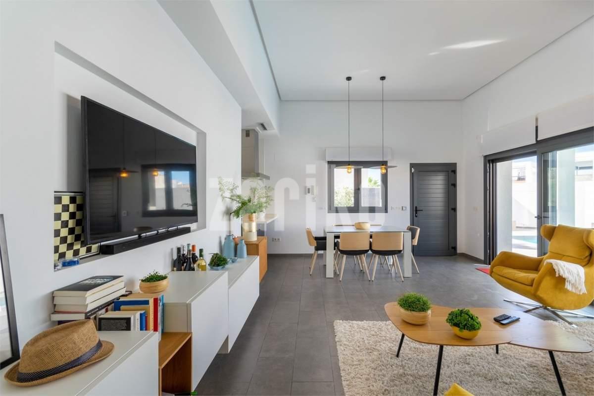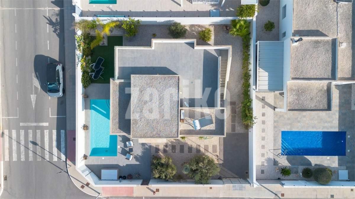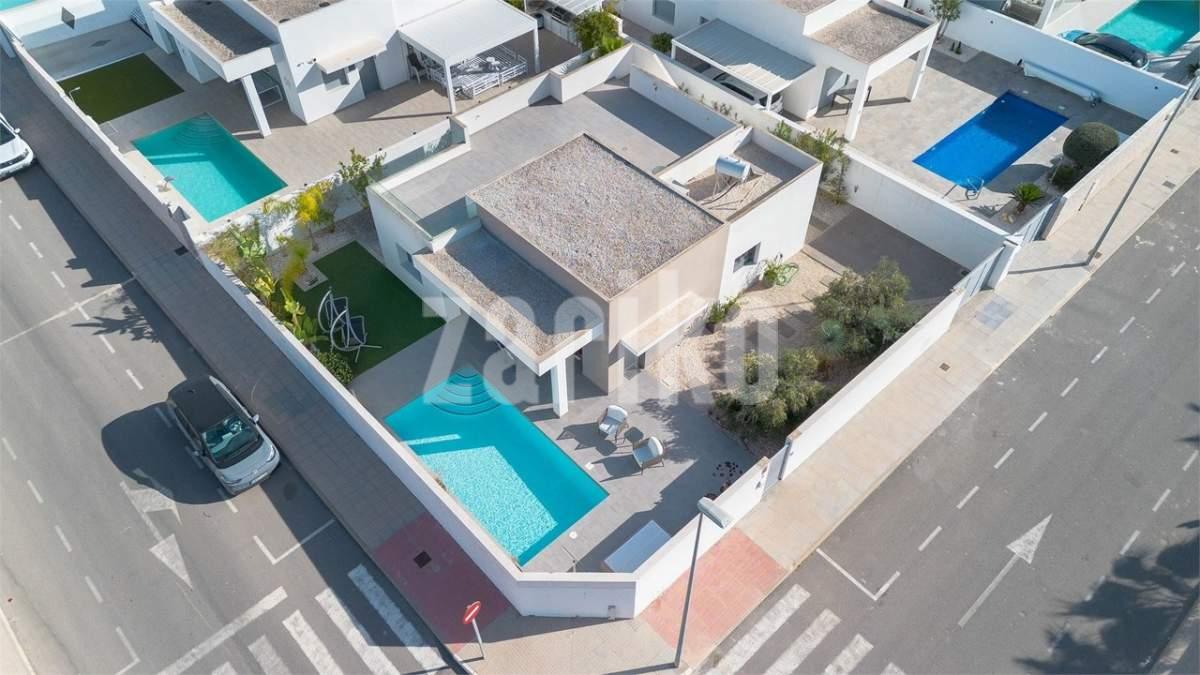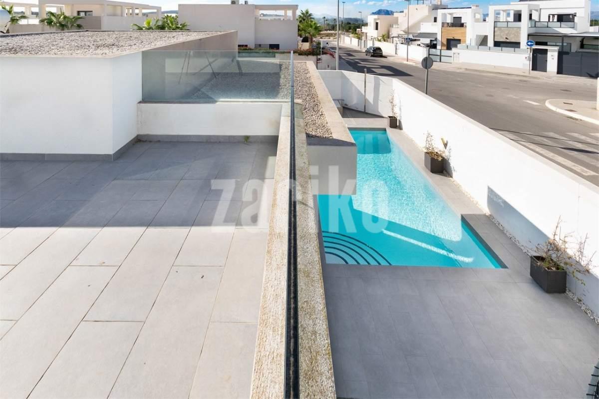 Stunning south facing corner detached villa with 3 bedrooms in Benijofar, Alicante. Within a 5 to 10 minute walk of the town centre or even Benimar where you can find a huge selection of amenities and facilities, and the nearest beaches are only a 10 minute drive away at Guardamar del Segura. The property is furnished and equipped to a very high standard and was built in 2016 by one of the top builders in the area. On entering the property you have an entrance hall with wardrobes giving plenty of storage space, an open plan fully fitted kitchen, a separate utility room, a spacious lounge/dining room with large sliding doors out to the garden, partly covered terrace overlooking the private garden and private swimming pool, three double bedrooms, the master with en suite shower room, all bedrooms come with fully fitted wardrobes and have direct access to terraces or the garden, and a family shower room. The property also boasts full air conditioning and under floor heating in the bathrooms.Outside is a beautifully landscaped garden, low maintenance with tiled, gravelled and artificial grassed areas, irrigation system, off road parking, private swimming pool with large patio areas having plenty of space for seating and sun bathing areas and the added bonus of raised walls to give you the added privacy on your plot.Benijofar is one of the villages that makes up the Vega Baja area on the Costa Blanca. It is a lovely village with a charming church and an attractive square/plaza. In Benijofar there are a lot of places to visit, for instance the Casa de Cultura where concerts and shows take place all year round. There is also a marked walking trail which includes the Rio Segura and an outdoor swimming pool. In Benijofar you can also find a walking and cycling route and the three crosses viewpoint. If you are a nature lover, you must visit the Cañada Marsa Park and El Secano Park. These two places are located in the commercial area of Benijofar, called Benimar.
