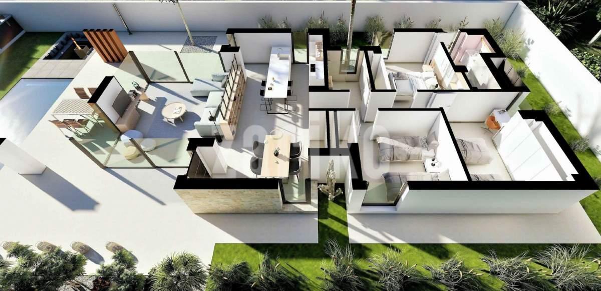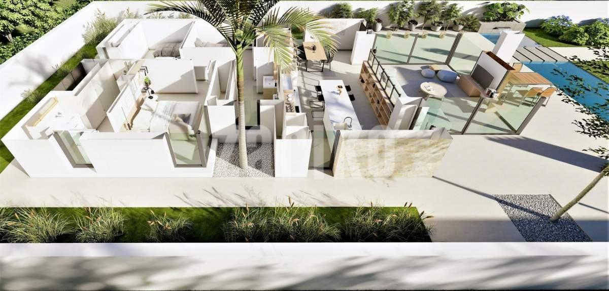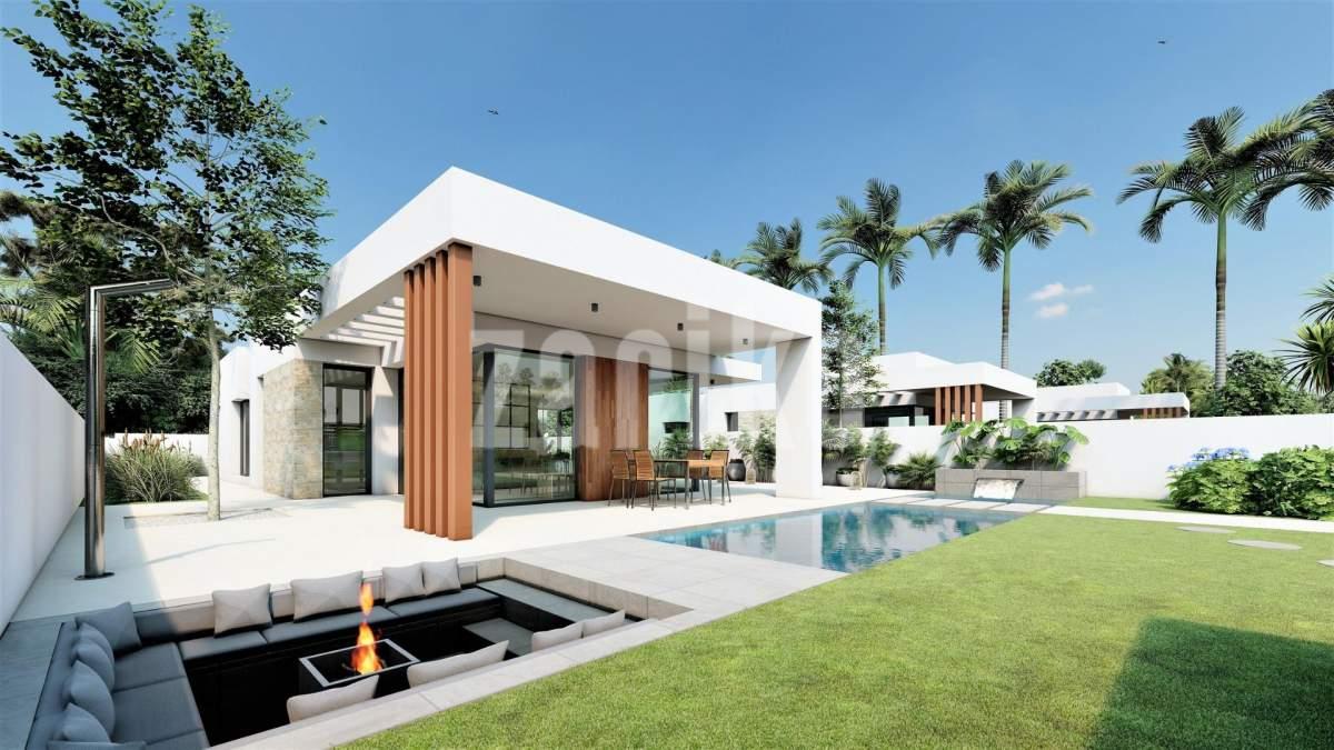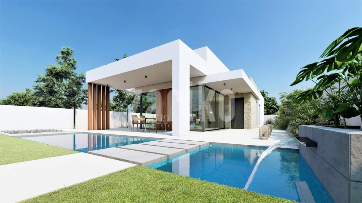 NEW BUILD VILLAS IN SAN FULGENCIO New Build villas San Fulgencio, just 5 km from the beach. The villas offer 3 bedrooms, 2 bathrooms and spacious kitchen, dining room, living room, swimming pool with waterfall and two pools: splash pool measuring 1.95x2.60 m and 0.6 m deep, and pool measuring 5.60x2.60 m, between 1 and 1.5 m variable depth. A large south facing porch allows the continuity of the living room with the outside, opening up to a modern and functional outdoor space where you can enjoy the private swimming pool, barbecue, chillout and large garden area that surrounds it. The simple and clear lines of the furniture contribute to its integration with the rest of the house. Wooden details add warmth to the atmosphere. Bathrooms where colour combined with natural and warm tones, create a cosy atmosphere, which together with the direct relationship with the outside ,allows you to connect with nature, achieving great moments of relaxation. The master bedroom has a private patio, which together with the light that penetrates through its windows, creates a relaxing atmosphere, perfect for rest and relaxation. San Fulgencio is a pleasant village with several restaurants and shops and the location is very good with its proximity to the fantastic beaches of La Marina and the slightly larger town of Guardamar. The town of San Fulgencio is situated around 30 minutes from Alicante-Elche airport, 6 km from the nearest golf course and just 5 km from the nearest beach.