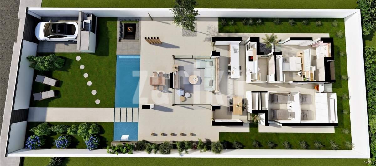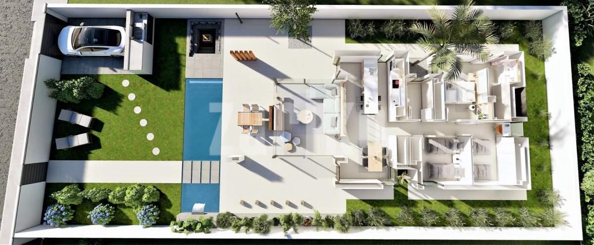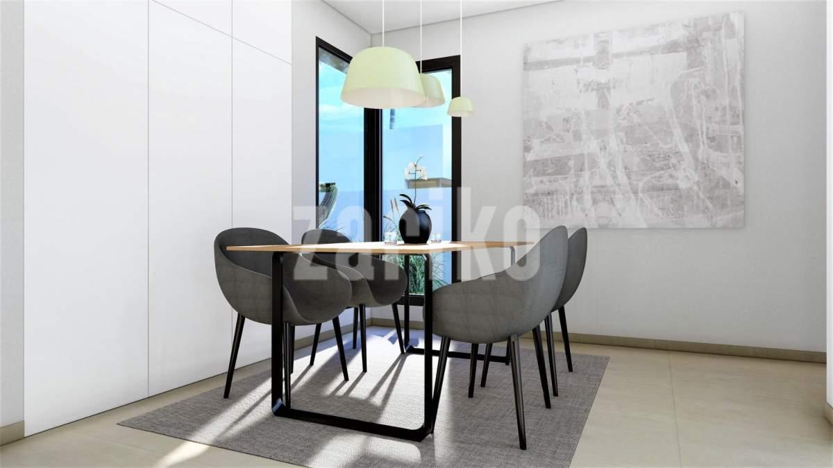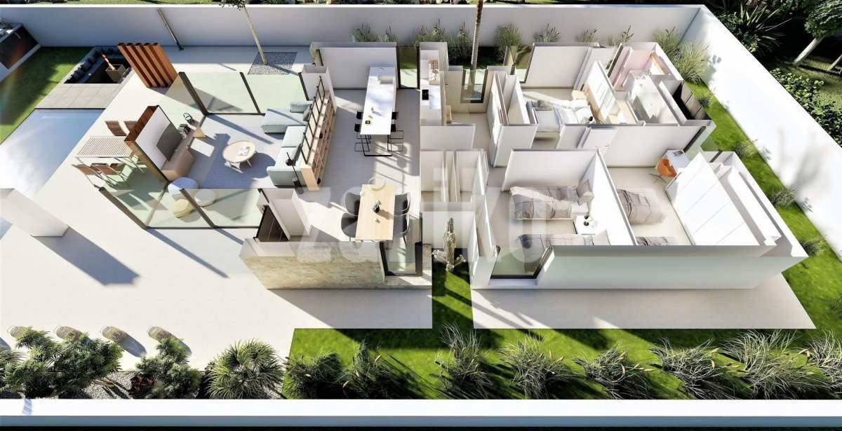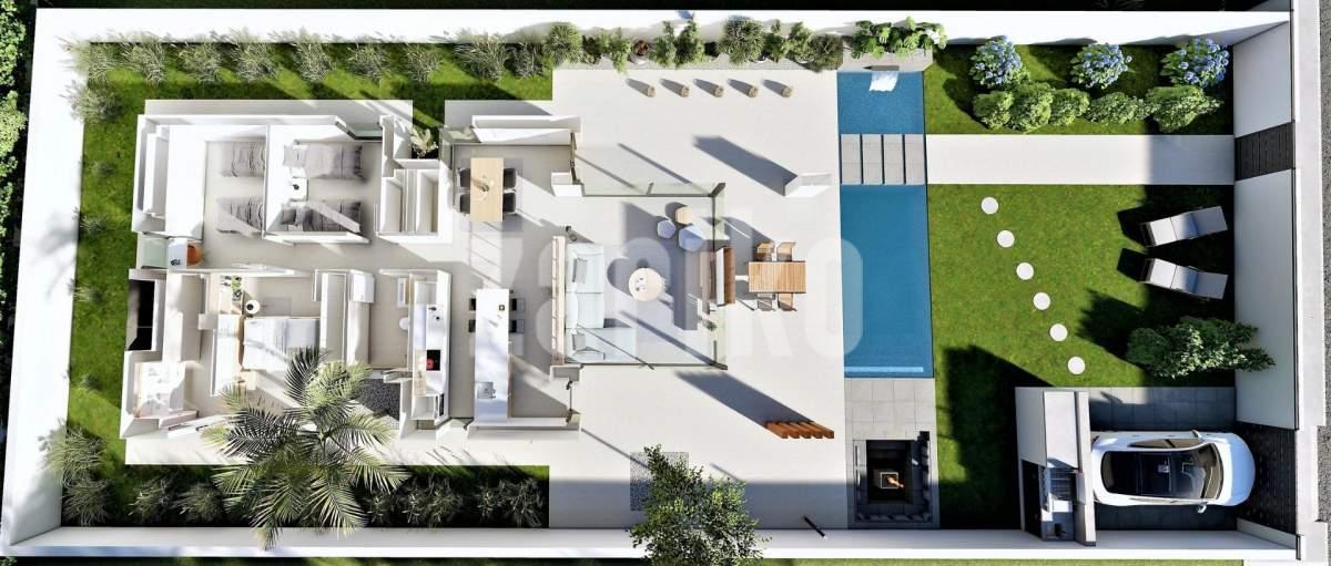 NEW BUILD VILLAS IN SAN FULGENCIO New Build villas San Fulgencio, just 5 km from the beach. The villas offer 3 bedrooms, 2 bathrooms and spacious kitchen, dining room, living room, swimming pool with waterfall and two pools: splash pool measuring 1.95x2.60 m and 0.6 m deep, and pool measuring 5.60x2.60 m, between 1 and 1.5 m variable depth. A large south facing porch allows the continuity of the living room with the outside, opening up to a modern and functional outdoor space where you can enjoy the private swimming pool, barbecue, chillout and large garden area that surrounds it. The simple and clear lines of the furniture contribute to its integration with the rest of the house. Wooden details add warmth to the atmosphere. Bathrooms where colour combined with natural and warm tones, create a cosy atmosphere, which together with the direct relationship with the outside ,allows you to connect with nature, achieving great moments of relaxation. The master bedroom has a private patio, which together with the light that penetrates through its windows, creates a relaxing atmosphere, perfect for rest and relaxation. San Fulgencio is a pleasant village with several restaurants and shops and the location is very good with its proximity to the fantastic beaches of La Marina and the slightly larger town of Guardamar. The town of San Fulgencio is situated around 30 minutes from Alicante-Elche airport, 6 km from the nearest golf course and just 5 km from the nearest beach.