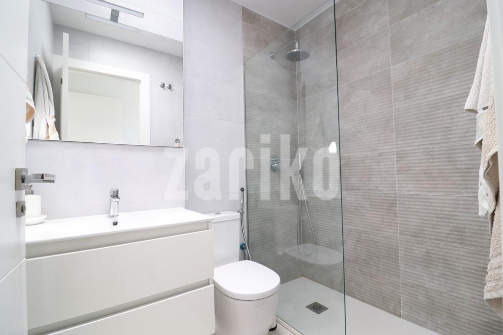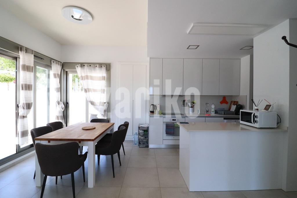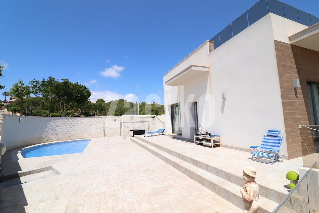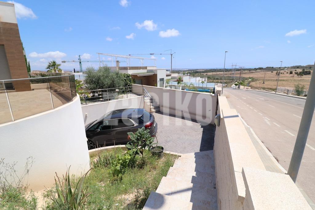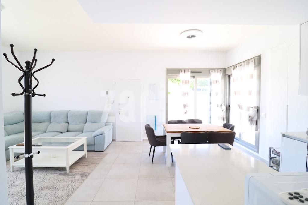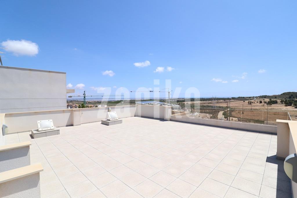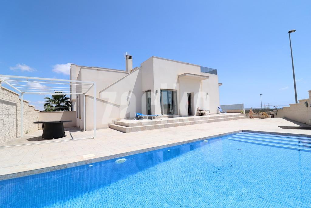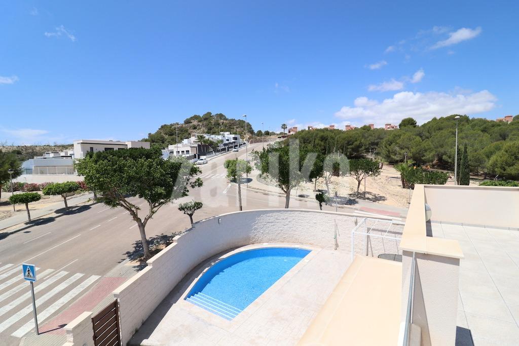 Residencial Vistabella, San Miguel de Salinas, corner villa with views of the sea and the salt lakes facing the park and facing South with a 405 m2 plot and a house on a 100 m2 floor with 3 bedrooms, 2 bathrooms, kitchen with its island open to the living room, gallery and a garage with direct access to the 153 m2 house, the house has a 60 m2 solarium, private pool and is sold furnished and with air conditioning.