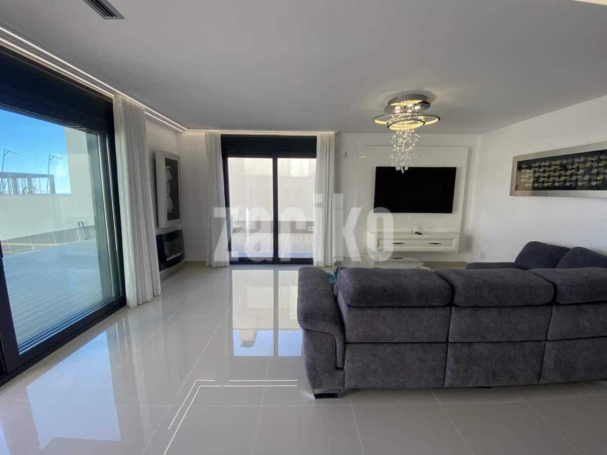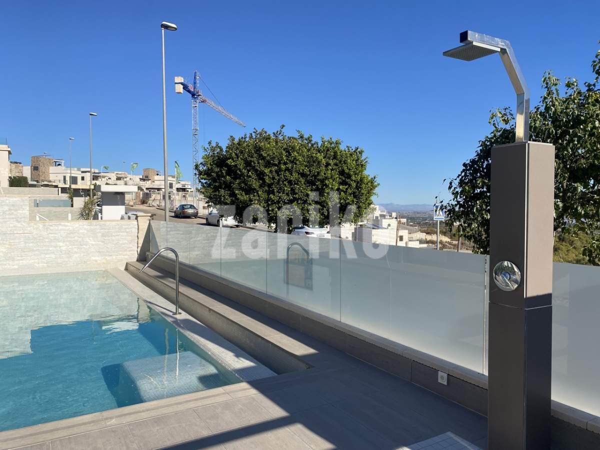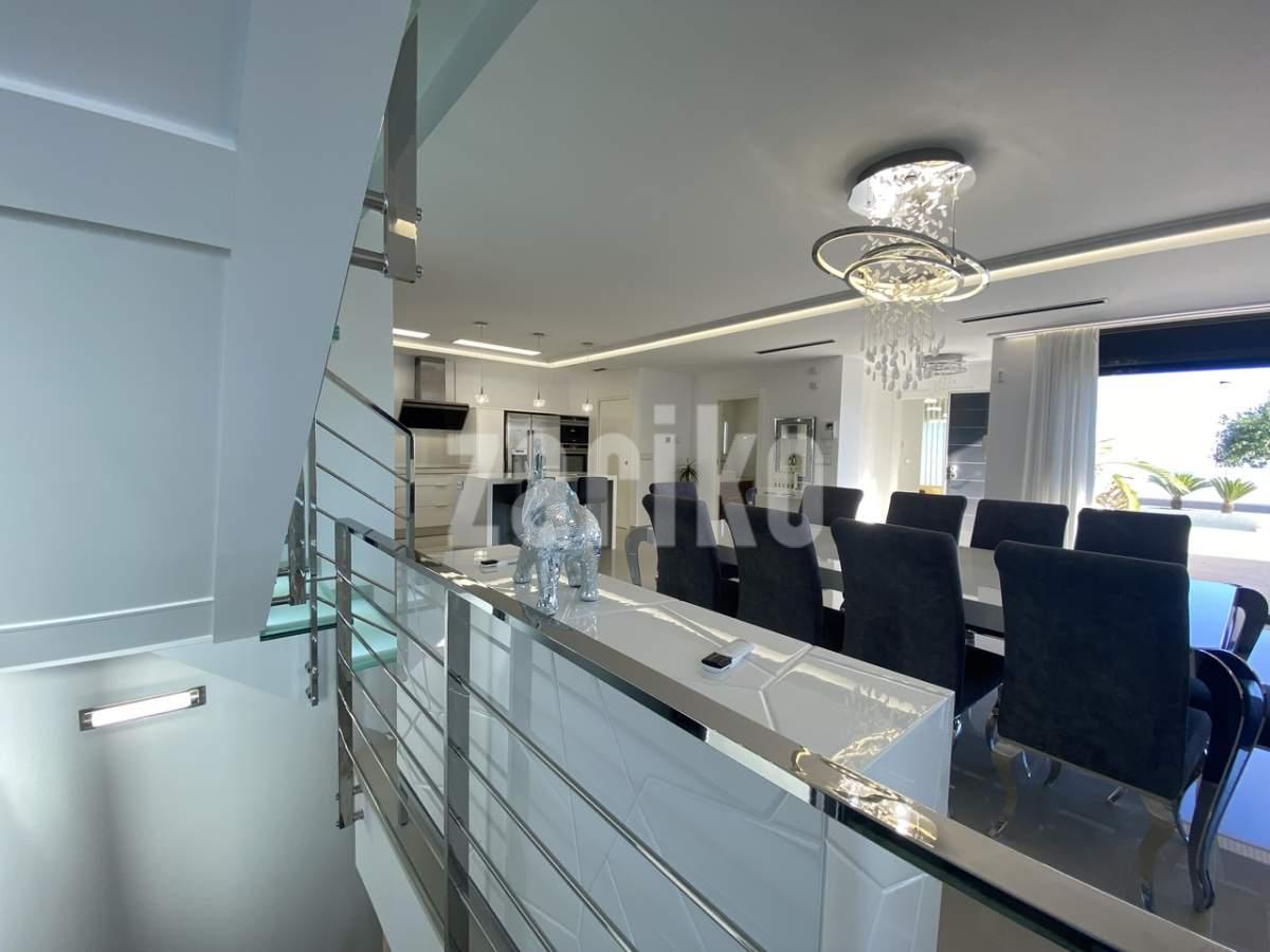 Welcome to this exceptional recently-built luxury villa at Residencial Bellavista, San Miguel de Salinas, offering a harmonious blend of contemporary design and breathtaking views. With a total of 5 bedrooms and 4 bathrooms, this meticulously crafted property spans two floors and a basement, accessible via a convenient elevator and a stunning glass staircase with interior lighting.The basement unfolds into a versatile game room with billiards and table football, a spacious celebration room featuring a full kitchen, 2 bedrooms, 2 storage rooms, and a well-appointed full bathroom. The main floor showcases a seamless living-dining space with an open-concept kitchen and central island, complemented by the main bedroom with an en-suite bathroom. Additionally, a laundry room and a guest toilet enhance the practicality of this level.Ascending to the first floor, you'll discover two generously proportioned bedrooms, two bathrooms, and access to charming balconies. The crowning jewel of this luxury villa is the top-floor 70m² solarium, providing an unparalleled vantage point to savor panoramic views.This property boasts an array of sophisticated features, including air conditioning, a dedicated parking area for multiple vehicles, central heating with underfloor heating throughout, and an elegant furnishing scheme featuring designer furniture. Noteworthy equipment encompasses a pellet machine for heating, solar panels, an electric water heater, security windows and doors, and a comprehensive security system with sensors in every room.The residence is thoughtfully equipped with high-quality amenities such as motorized sofas, brand-new mattresses, a steam oven with pyrolysis, and a combo fridge that dispenses both normal and crushed ice.The outdoor space is a haven of luxury, featuring a private pool with a cascading waterfall, jacuzzi, and hydromassage. The meticulously landscaped poolside area is adorned with lush vegetation, and a convenient outdoor shower adds to the indulgent ambiance. Ample parking within the plot ensures convenience for multiple vehicles.Situated in Residencial Bellavista, just 7 kilometers from the Orihuela beaches, this enclave is surrounded by golf courses and hosts the area's premier shopping center with an array of services, bars, restaurants, shops, and supermarkets. Ideal for nature and tranquility enthusiasts, this residence offers a lifestyle of unparalleled elegance and comfort.