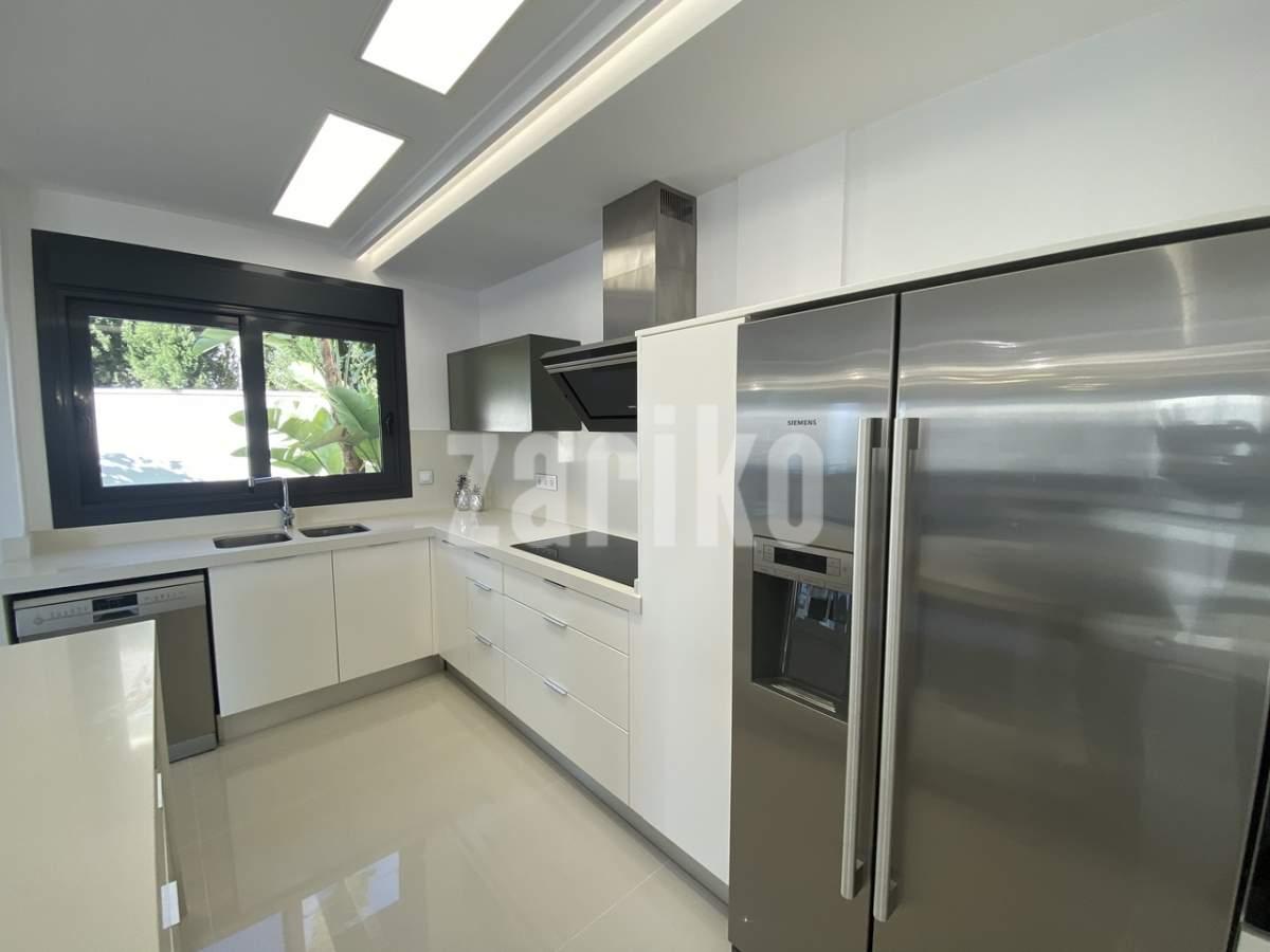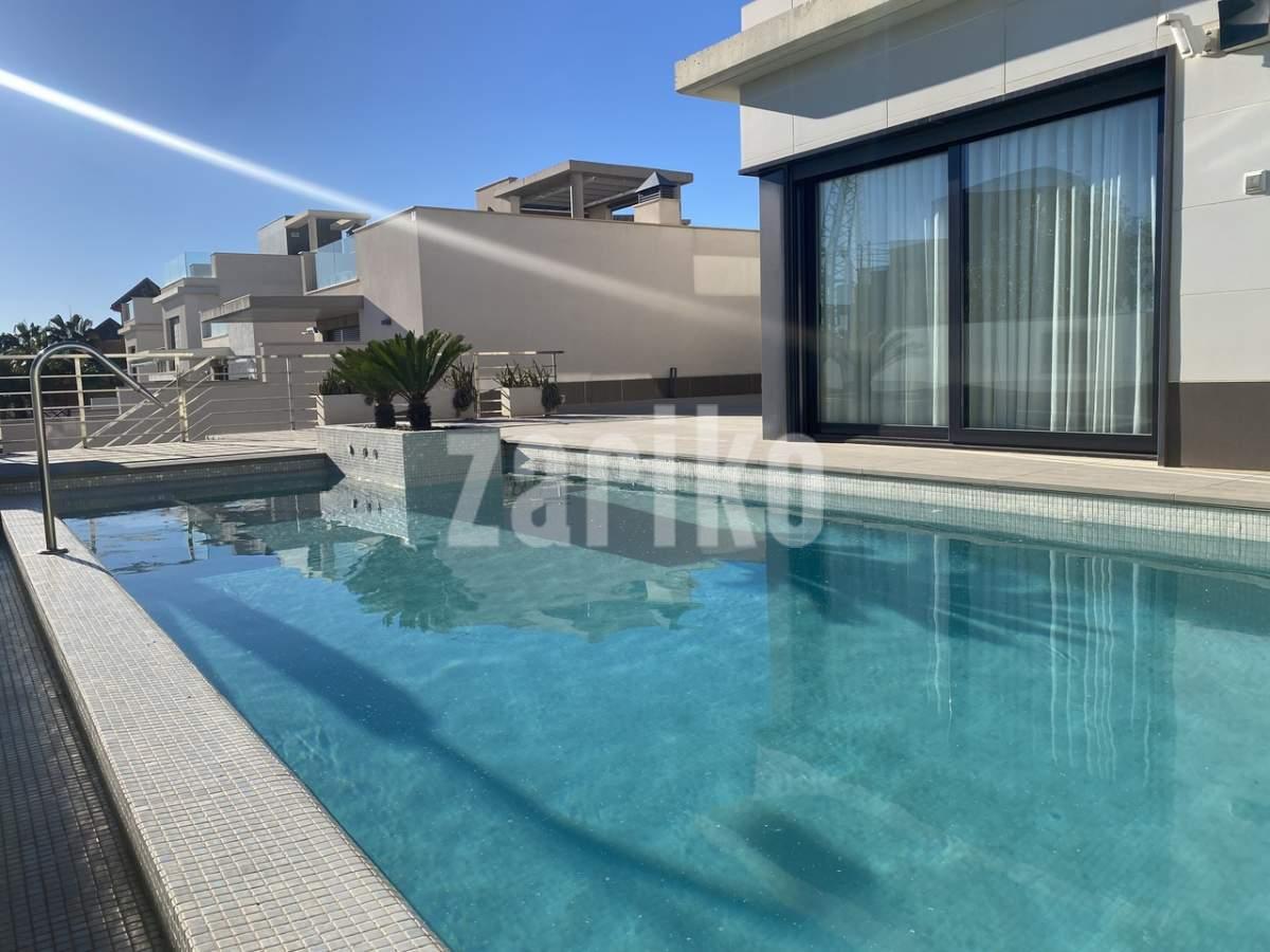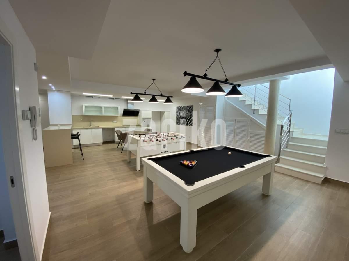 Welcome to this exceptional recently-built luxury villa at Residencial Bellavista, San Miguel de Salinas, offering a harmonious blend of contemporary design and breathtaking views. With a total of 5 bedrooms and 4 bathrooms, this meticulously crafted property spans two floors and a basement, accessible via a convenient elevator and a stunning glass staircase with interior lighting.The basement unfolds into a versatile game room with billiards and table football, a spacious celebration room featuring a full kitchen, 2 bedrooms, 2 storage rooms, and a well-appointed full bathroom. The main floor showcases a seamless living-dining space with an open-concept kitchen and central island, complemented by the main bedroom with an en-suite bathroom. Additionally, a laundry room and a guest toilet enhance the practicality of this level.Ascending to the first floor, you'll discover two generously proportioned bedrooms, two bathrooms, and access to charming balconies. The crowning jewel of this luxury villa is the top-floor 70m² solarium, providing an unparalleled vantage point to savor panoramic views.This property boasts an array of sophisticated features, including air conditioning, a dedicated parking area for multiple vehicles, central heating with underfloor heating throughout, and an elegant furnishing scheme featuring designer furniture. Noteworthy equipment encompasses a pellet machine for heating, solar panels, an electric water heater, security windows and doors, and a comprehensive security system with sensors in every room.The residence is thoughtfully equipped with high-quality amenities such as motorized sofas, brand-new mattresses, a steam oven with pyrolysis, and a combo fridge that dispenses both normal and crushed ice.The outdoor space is a haven of luxury, featuring a private pool with a cascading waterfall, jacuzzi, and hydromassage. The meticulously landscaped poolside area is adorned with lush vegetation, and a convenient outdoor shower adds to the indulgent ambiance. Ample parking within the plot ensures convenience for multiple vehicles.Situated in Residencial Bellavista, just 7 kilometers from the Orihuela beaches, this enclave is surrounded by golf courses and hosts the area's premier shopping center with an array of services, bars, restaurants, shops, and supermarkets. Ideal for nature and tranquility enthusiasts, this residence offers a lifestyle of unparalleled elegance and comfort.