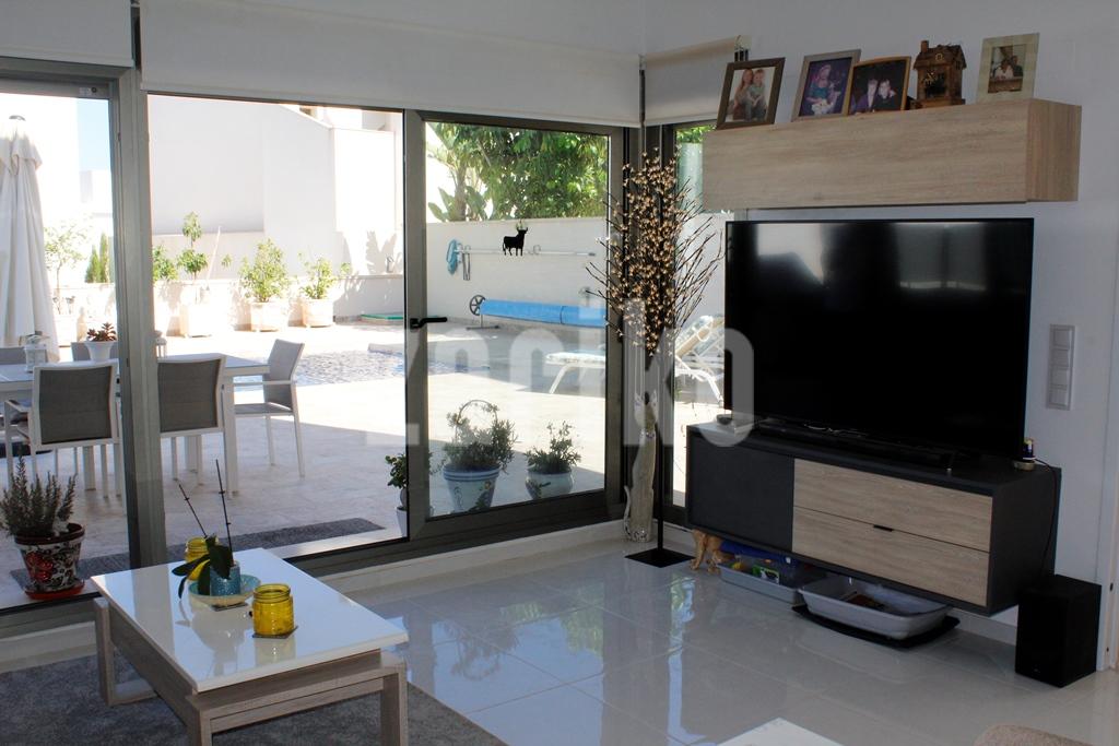 Wonderfully modern and stylish, *READY TO MOVE IN* fully furnished 3 bed, 3 en-suite bathrooms DETACHED LUXURY VILLA, located in the quiet location of SAN MIGUEL DE SALINAS but only 3km away from the main village with plenty of amenities and within 10km of the vibrant commercial centres, shopping malls, golf courses and the crystal clear beaches of the Orihuela Costa!Coming into the large plot of 388m2 there is space to park the car inside with entrance via an electric gate, it has an easy to maintain garden/terrace area (all tiled) with a lovely private pool where you can catch the sun all day and enjoy the outdoors.The house is oriented south-east and benefits from plenty of natural daylight thanks to the open spaces and large windows. The villa has a beautiful spacious open plan living and dining area and comprises of a bright lounge/dining room with a fully-fitted kitchen with quality appliances, a bedroom with ensuite bathroom downstairs, 2 bedrooms with two ensuite bathrooms with shower and a terrace with nice open views upstairs.From the second-floor there are exterior stairs that lead up to the large unobstructed 49 m2 private roof terrace. From here you have amazing views of the rural countryside, salt lakes and the Mediterranean sea. This would make a wonderful area to sit and have a BBQ or have drinks with friends or just relax with a good book and enjoy the sun all day long.At the front of the property, you have a lovely seating area that gives you access to spacious and bright living room by sliding doors that overlook the pool. The property further benefits from large wardrobes in bedrooms upstairs, floor heating in 3 bathrooms, centralized hot and cold air conditioning, electric shutters and gate. The location of this luxury villa is close to various golf courses such as Las Colinas Golf & Country Club, Campoamor Golf, Las Ramblas Golf and Villamartin Golf. With beautiful open views over the rural countryside, you are just a 10-minute drive from the beaches of La Zenia, Playa Flamenca, Cabo Roig and Campoamor, plus close to supermarkets, restaurants and the popular shopping centre of La Zenia Boulevard with 150 shops or the Villamartin Plaza.Both Airports Alicante and Corvera Murcia are respectively only a 45 minutes’ drive. This is a high quality and beautiful villa in pristine condition and we highly recommend viewing !