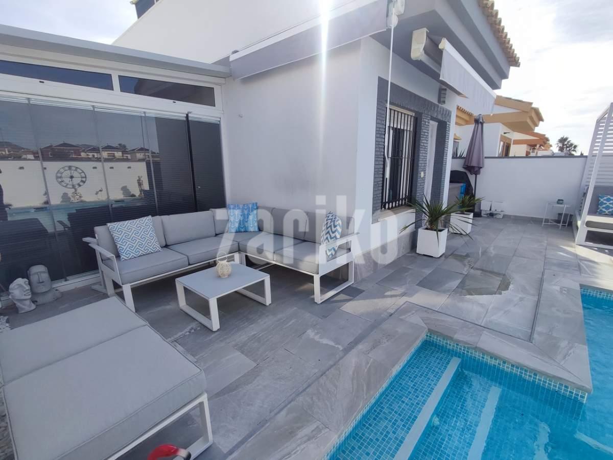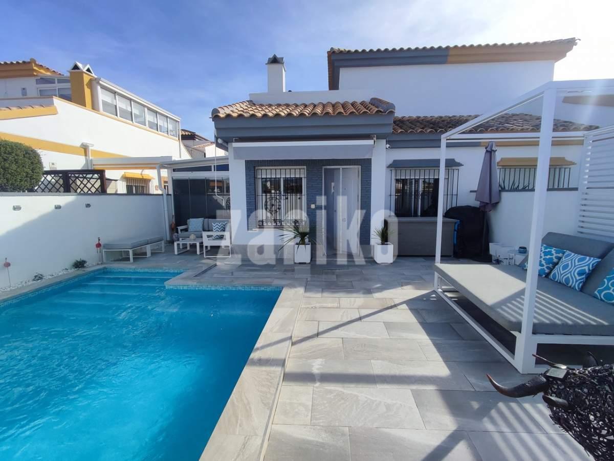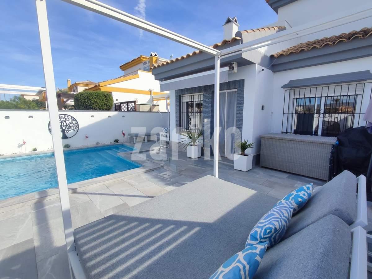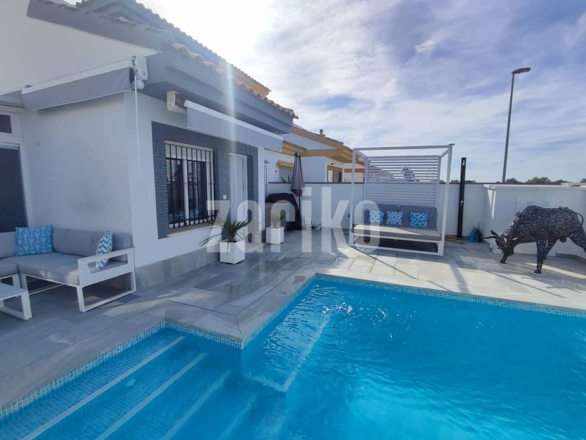 This 3-bedroom sunny villa has a new private, swimming pool, patio and sun-bathing area with awnings that also create shady areas.The inside of the property has been upgraded with a new kitchen and 2 modern bathrooms with walk in shower.A covered patio has been added to the side of the property creating extra living space and for entertaining.The property is located just a 3 minute - walk from all amenities that the popular town of Sucina offers including a great selection Bars & Restaurants, Medical Centre, Takeaways, Banks, Pharmacy, Beauticians, Hairdressers and a local school. The property is very well located being only 15 minutes’ drive to the Beaches of the Mar Menor and the holiday resorts of Los Alcazares and Lo Pagan, 25 minutes from Murcia Airport and 55 minutes from Alicante Airport. The Cities of Cartagena and Murcia can also be reached with 30 minutes.