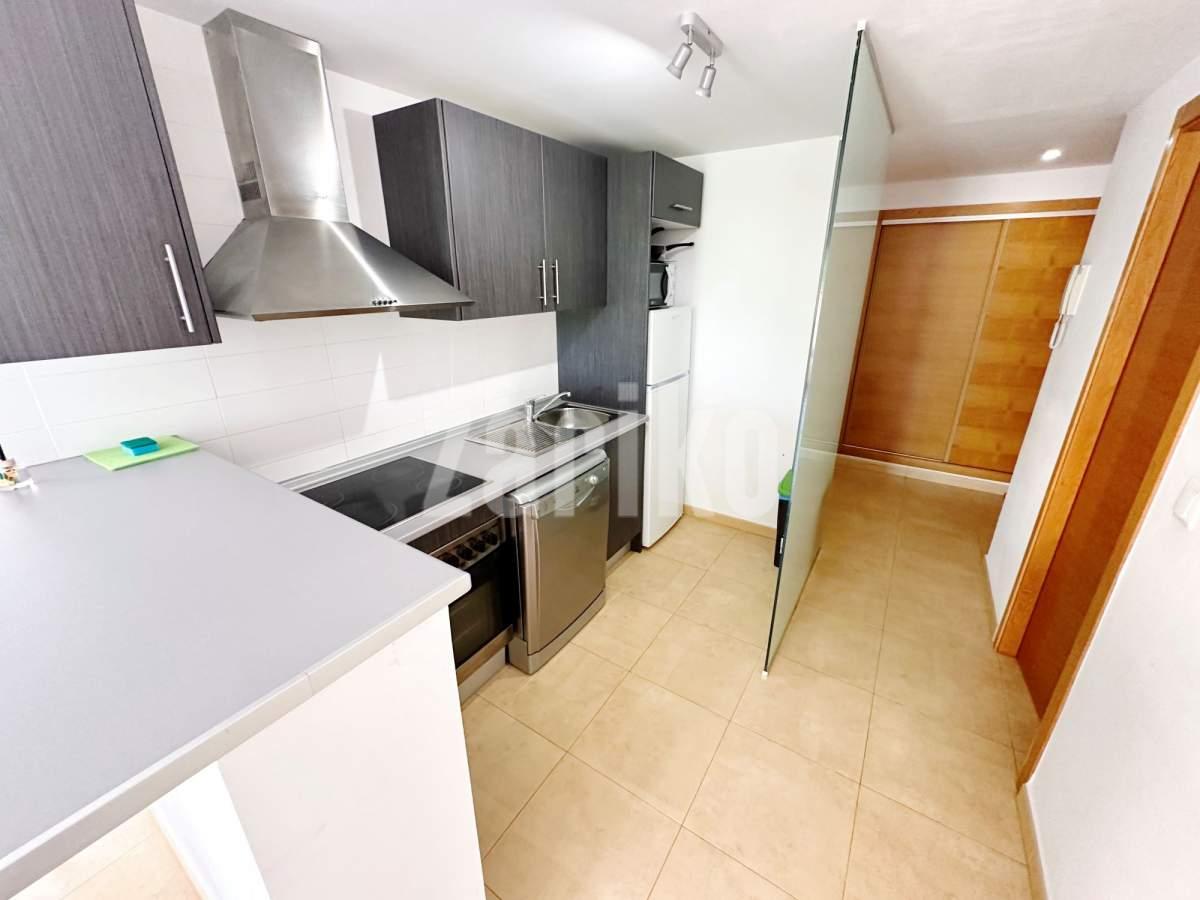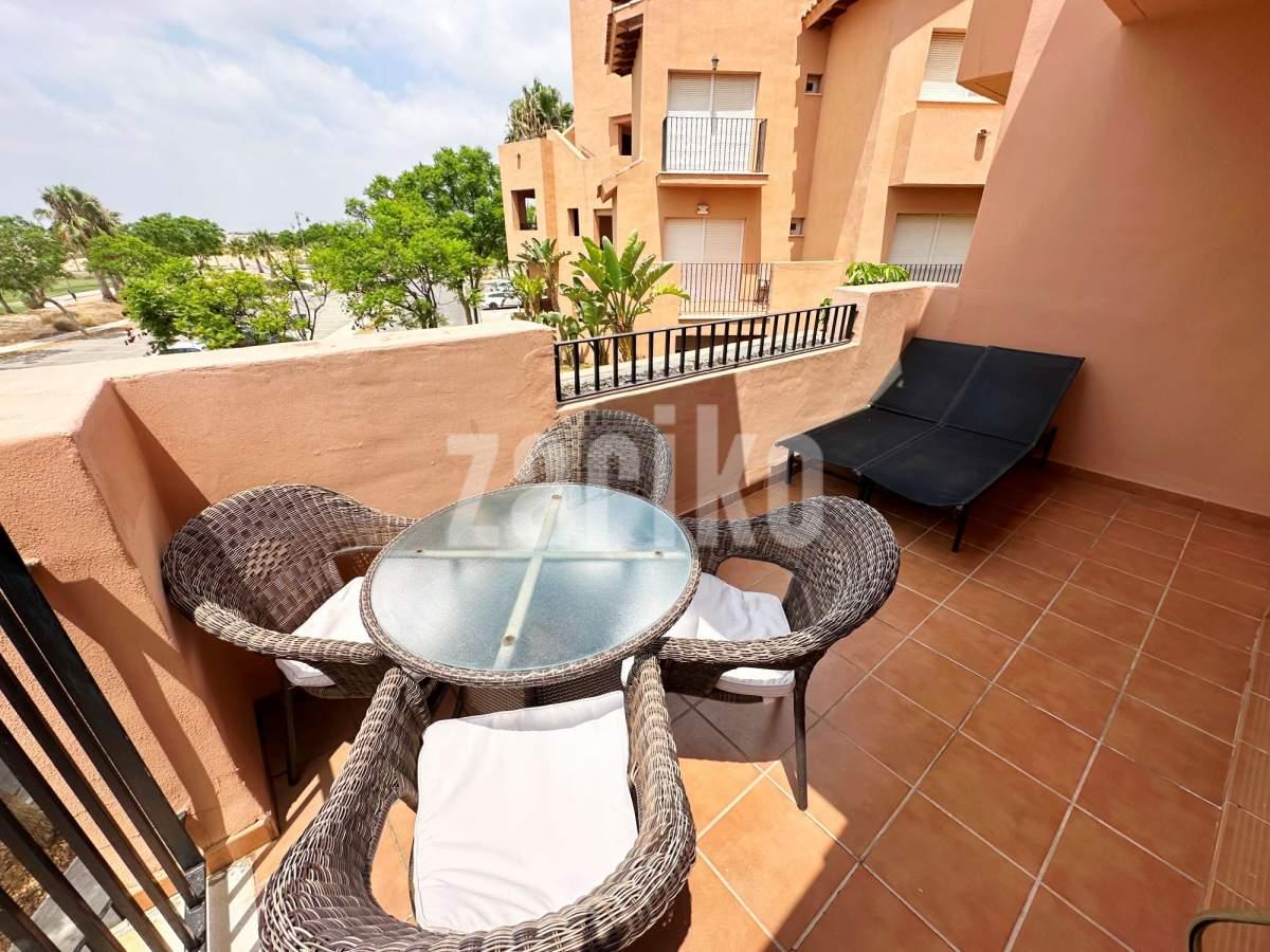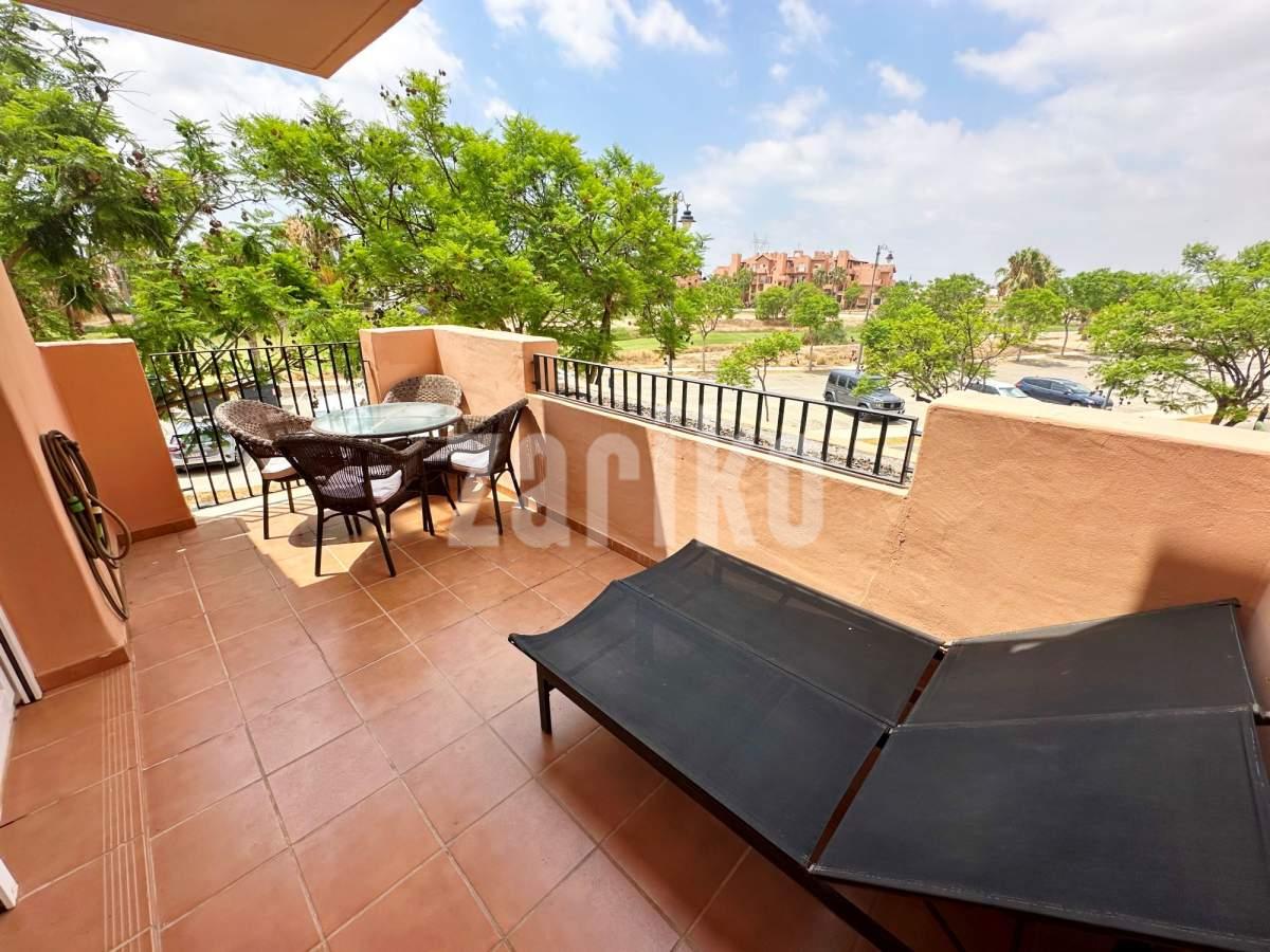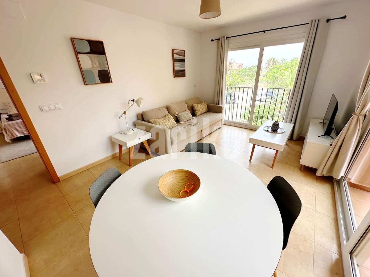 We are thrilled to offer this one bedroom one bathroom first floor apartment located on Mar Menor Golf Resort which has ample abrs, restaurantes and amenities. This resort is just 5 kms to the beach and the coastal town of Los Alcazares and just 25 minutes drive to murcia Airport.On entering this apartment there is a double wardrobe to your right which on one side is the boiler nad washing machine. Down the hallway and on the left is the family bathroom which has a window for ventilation. The kitchen is open plan with a breakfast bar and leads into the lounge which is bathed in light due to a window and the large patio doors that take you onto one of the two terraces. Off the lounge is the large master bedroom which has fitted wardrobes and patio doors to the south west facing terrace. This property comes with underground parking with lift access, new Hisense vented AC and comes furnished.