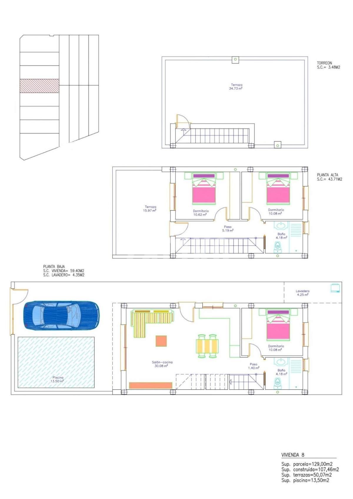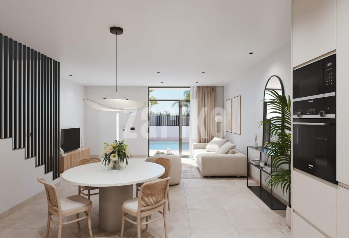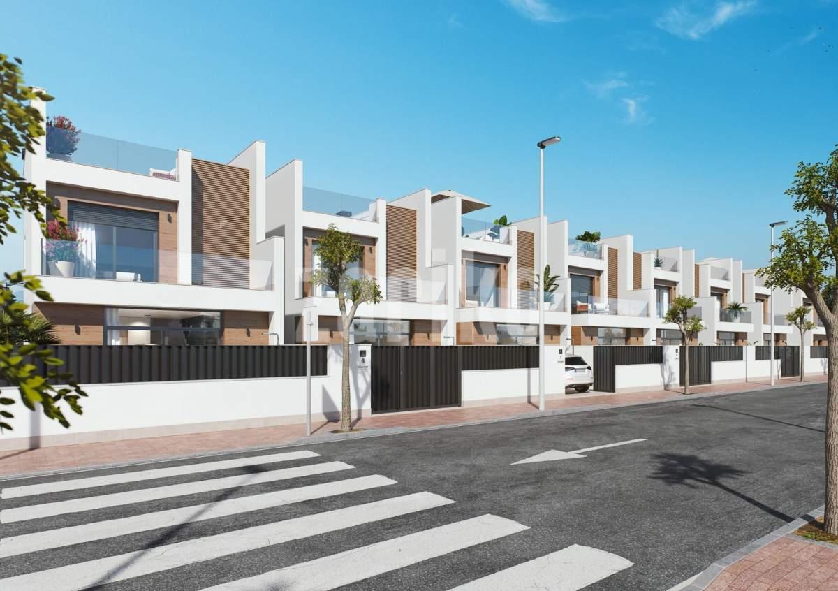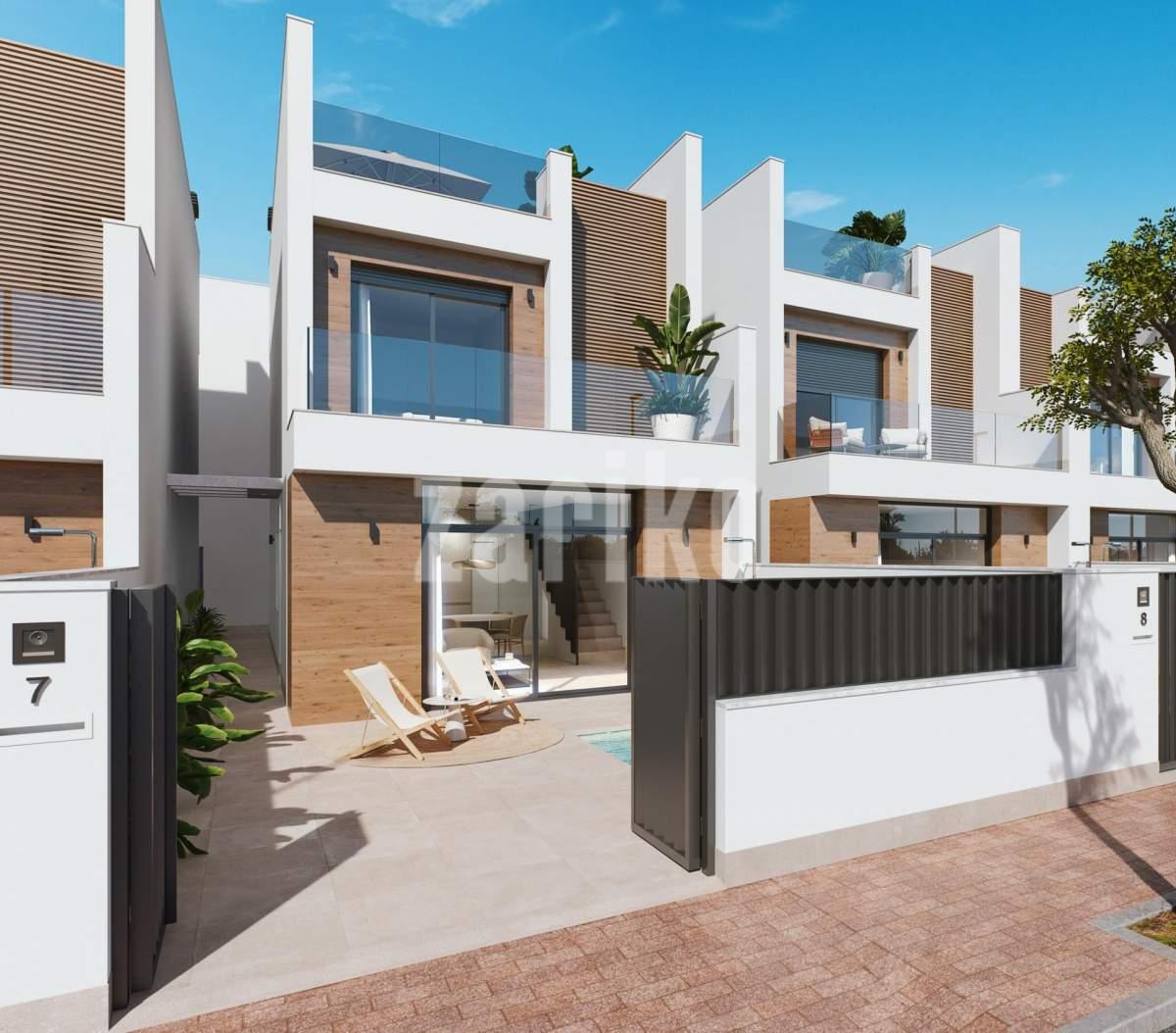 NEW BUILD VILLAS IN SAN PEDRO DEL PINATAR New development of villas and townhouses in San Pedro del Pinatar, Murcia. Luxury residential complex made up of 16 townhouses and detached villas, all with private swimming pool, terrace, solarium and parking space within the plot. Each property has 3 bedrooms and 2 complete bathrooms, as well as a dressing room in the master bedroom. The properties have been designed with a contemporary style and an open concept, consisting of a fully fitted kitchen and a living-dining room. The development is located in San Pedro del Pinatar, Murcia, surrounded by all amenities, sports facilities, close to several golf courses and 5 minutes from the Mediterranean Sea and the beaches of the Mar Menor. The property will meet the highest standards and will be equipped with: Private swimming pool with LED lighting and outdoor shower. Fully fitted and equipped kitchen with oven and microwave in column, built-in dishwasher and fridge freezer, ceramic hob and extractor hood. LED lighting: inside the property (dining room, kitchen, corridors and bathrooms), as well as in outdoor areas. Motorised blinds in living room and master bedroom. Dressing room in master bedroom, with shelves, drawer unit, pull-out bars and mirror. Wardrobes lined with drawers. Complete bathrooms with washbasin unit, wall-hung toilet with built-in cistern, mirror, rain-effect shower and screens. Pre-installation of underfloor heating in bathrooms. Pre-installation of air conditioning ducts. Pre-installation of solar panels. Solarium. Parking inside the plot. San Pedro del Pinatar's privileged location on the Mar Menor and the Mediterranean coast attracts those with an interest in sailing and water sports, providing moorings at the marina and sailing clubs, while the beaches and natural mud baths attract those seeking sun, sea and sand for safety. The benefits of the mud baths, typical of the region, or the calm waters of the Mar Menor, have favoured the growth of Lo Pagán-San Pedro del Pinatar, which now has all kinds of amenities. It also has an excellent location, just 5 minutes from the Dos Mares Shopping Centre. Murcia/Corvera airport is 30 minutes away and Alicante airport is an hour's drive away.